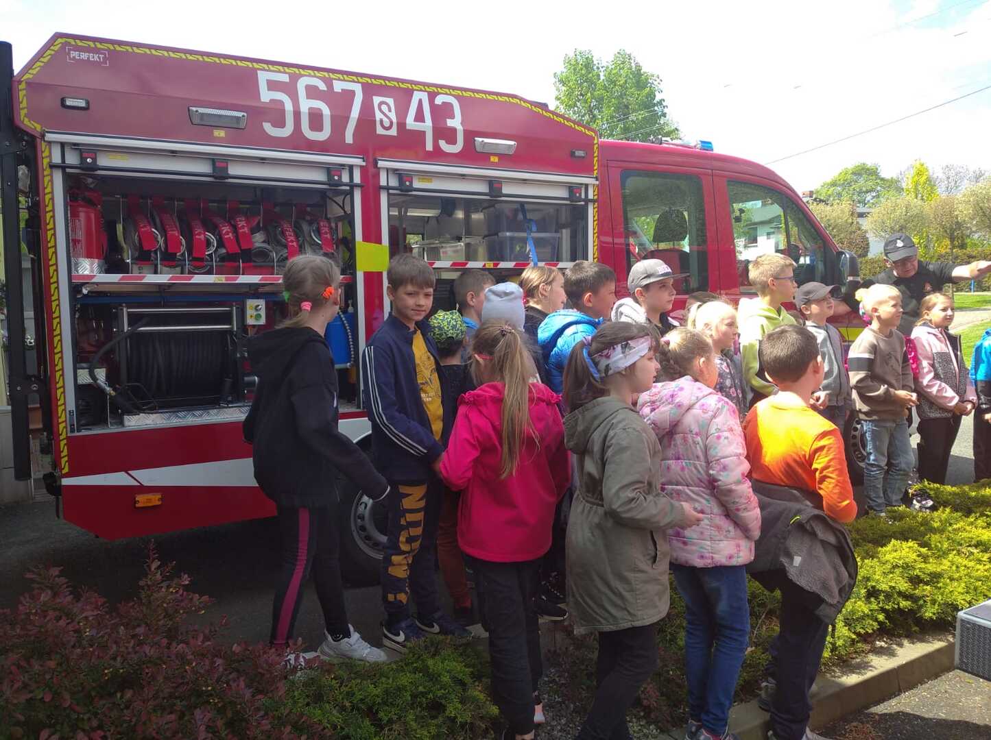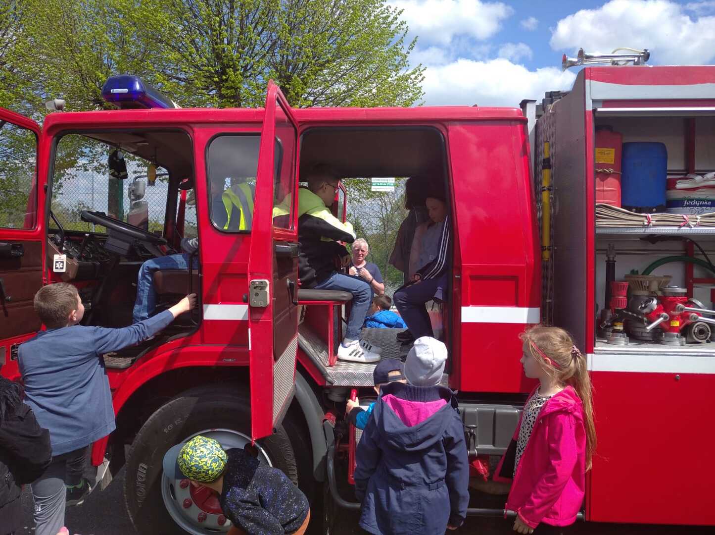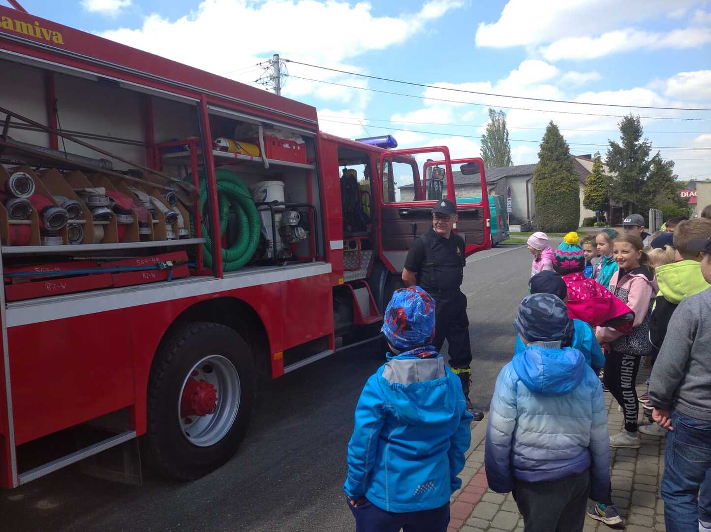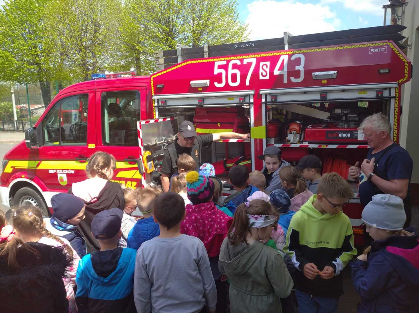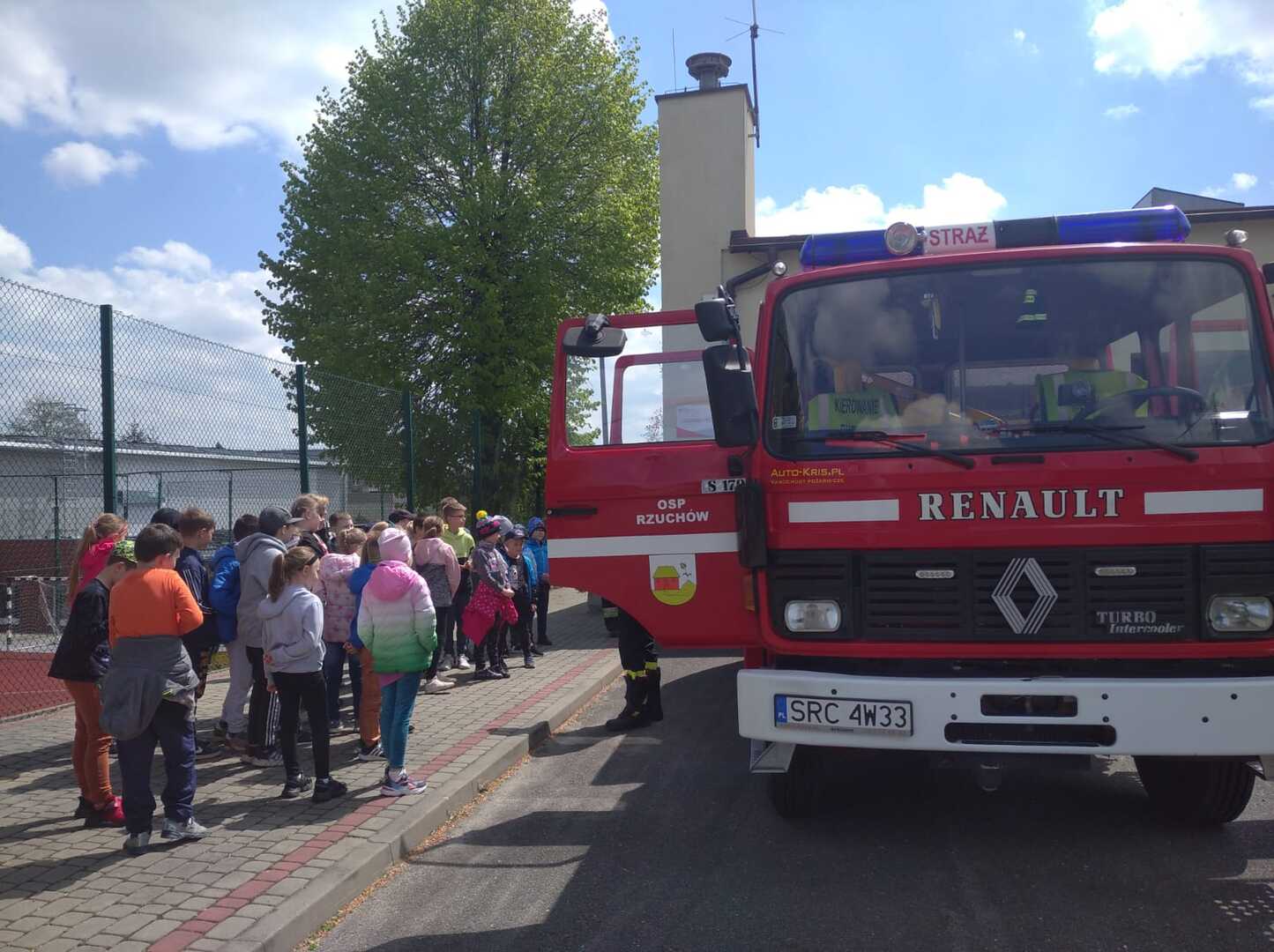 9 maja uczniowie klas I-III wraz z opiekunami udali się z wizytą do OSP w Rzuchowie, by z bliska przyjrzeć się jak wygląda praca strażaka. Na miejscu, dzieci przywitali Panowie strażacy, którzy zaprezentowali sprzęt gaśniczy będący wyposażeniem jednostki - wozy strażackie, sprzęt do gaszenia pożarów, apteczkę, ubrania strażackie. Chętni mogli wejść do wozów i usiąść za kierownicą. Podczas pogadanki, strażacy przekazali uczniom cenne informacje na temat gaszenia, zachowania bezpieczeństwa, sposobach alarmowania i zachowania się na wypadek zagrożenia nie tylko pożarowego, ale też w czasie powodzi czy ratowania zwierząt. Niektórzy uczniowie złożyli deklarację, że w przyszłości chcą zostać strażakami. Na zakończenie dzieci podziękowały za ciekawą lekcję i cenne wskazówki oraz wręczyły drobny upominek z okazji niedawno obchodzonego Święta Strażaka. Zaś dzieci otrzymały od gospodarzy słodkości i ,,Poradnik na trudne czasy”.