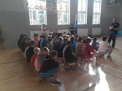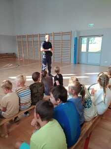 Przypomniał uczniom o zasadach bezpiecznego poruszania się po drogach. Zaznaczył, że bardzo ważnym elementem, podnoszącym nasze bezpieczeństwo jest noszenie odblasków. Omówił, jak należy poruszać się po drodze bez chodnika, na przejściu dla pieszych. Przypomniał o zakładaniu kasku podczas jazdy na rowerze. Wspomniał również o tym, żeby zachować szczególną czujność wobec napotkanych zwierząt, aby ich nie dotykać, nie płoszyć i nie prowokować, a także o ograniczonym zaufaniu wobec osób nam nieznanych.