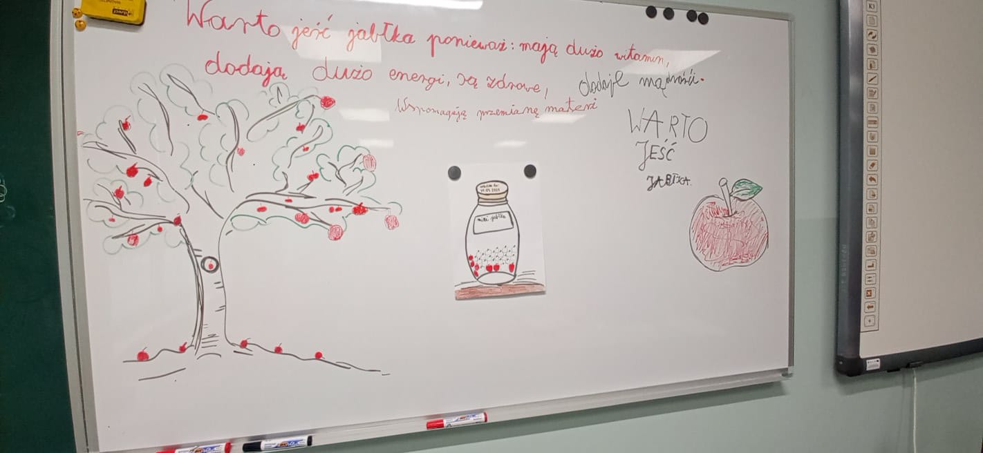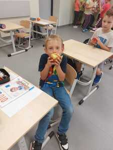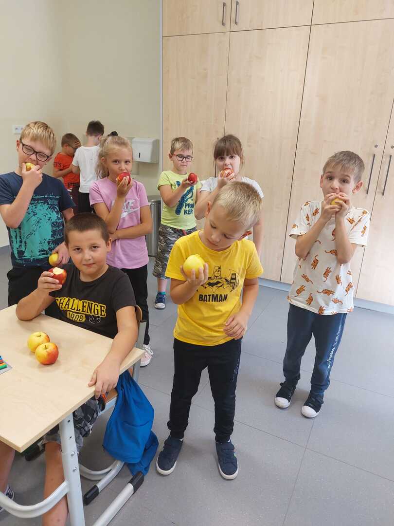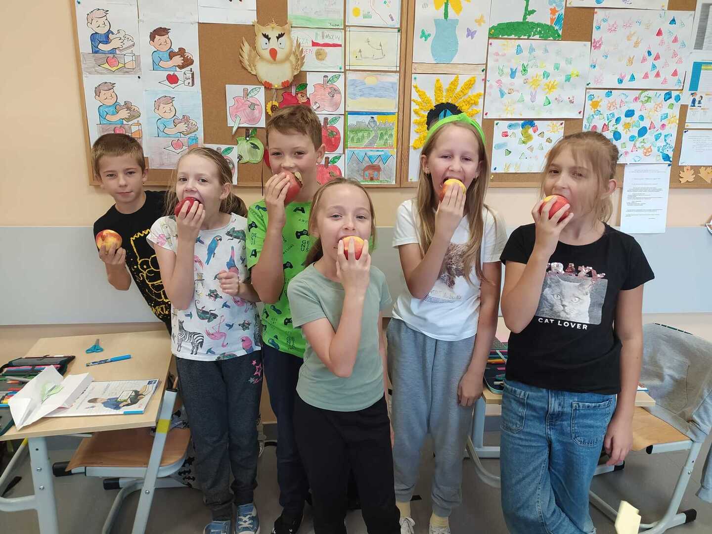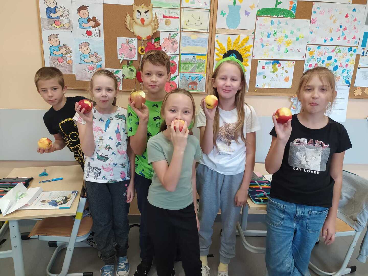 W ramach obchodów Światowego Dnia Jabłka uczniowie klas I-IV uczestniczyli w zajęciach, które miały na celu zachęcenie dzieci do spożywania jabłek, poznania ich wartości zdrowotnych oraz kształcenie nawyku zdrowego odżywiania się. Poszczególne klasy przez tydzień miały do wykonania określone zadania - od labiryntów, krzyżówek, zadań matematycznych, haseł reklamowych, po wykonanie zróżnicowanych prac plastycznych. Podczas akcji wszyscy uczestnicy zabaw zajadali się tymi wspaniałymi owocami, które urozmaiciły posiłek uczniów w szkole.