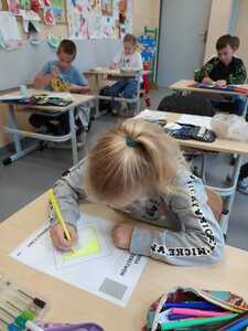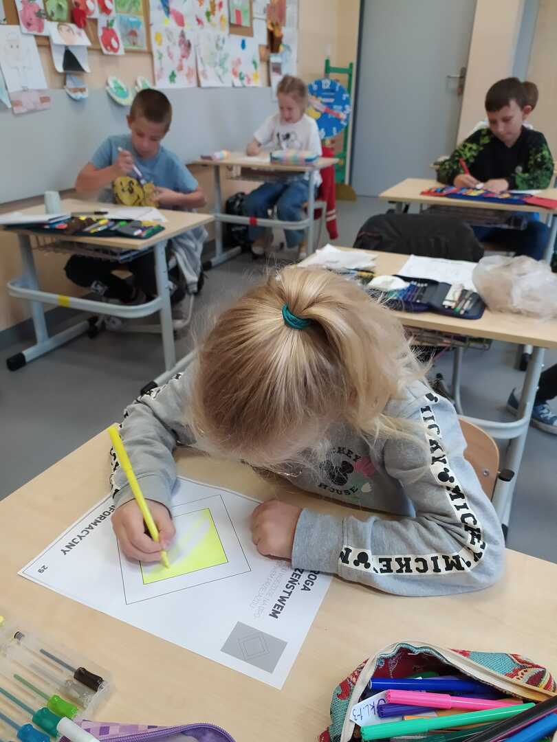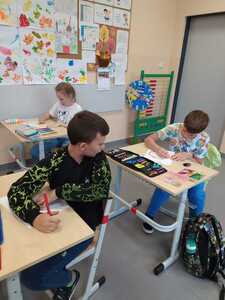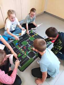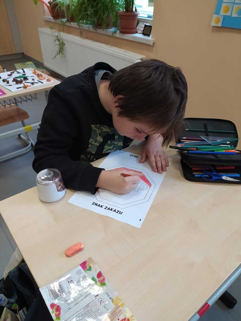 Podczas szkolnej kawiarenki wszyscy uczniowie mogli skorzystać z zabaw planszowych dotyczących znaków i przepisów drogowych zwłaszcza dla pieszych i poruszających się pojazdami. Zabawa sprawiła wielką radość. Największym powodzeniem cieszyły się maty z makietą tras, po których można było poruszać się autkami i ustawiać miniaturowe znaki drogowe. Dla tych którzy lubią kolorowanki czekały obrazki znaków do zapełnienia odpowiednimi kolorami.