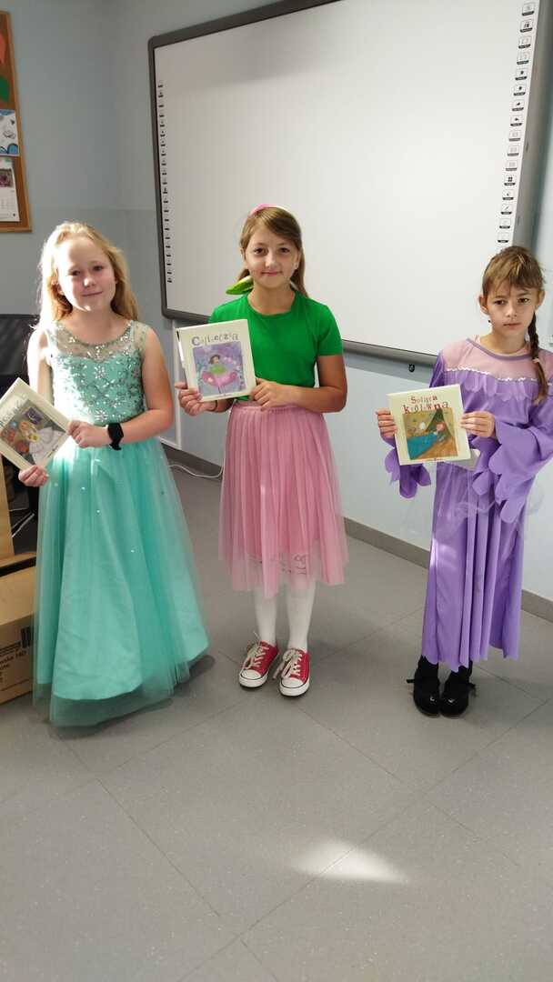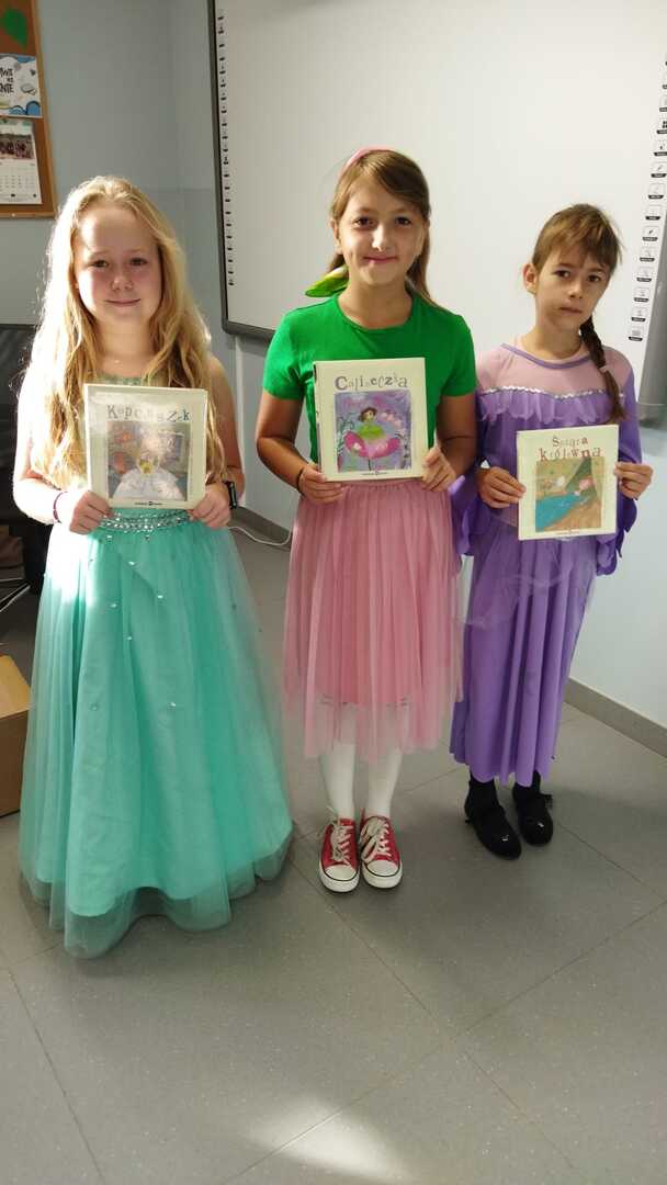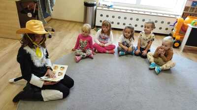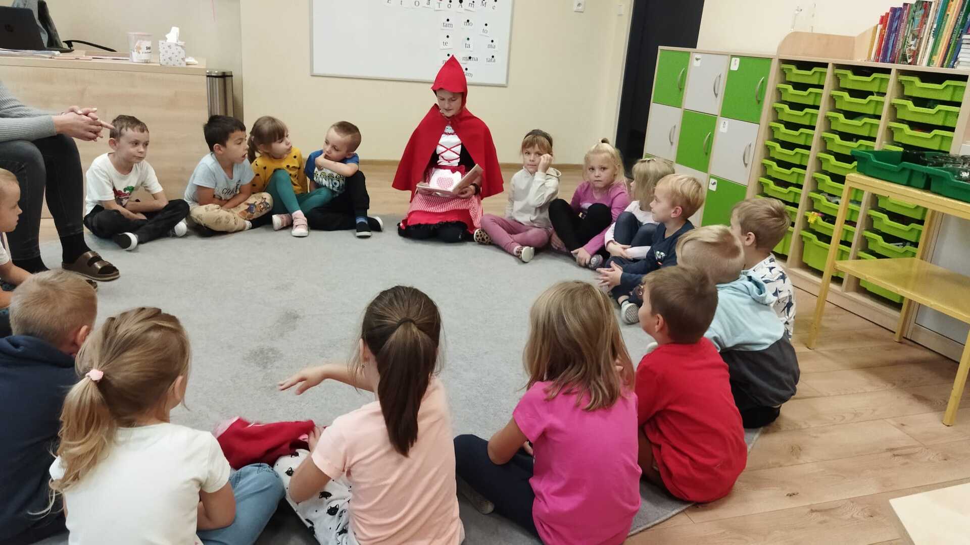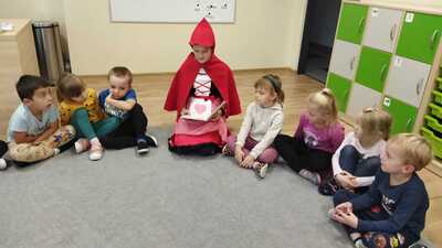 Do przedszkola zawitał Czerwony Kapturek oraz Kot w butach – przebrane uczennice klasy szóstej. Bajkowe postacie przeczytały najmłodszym dzieciom bajeczki.