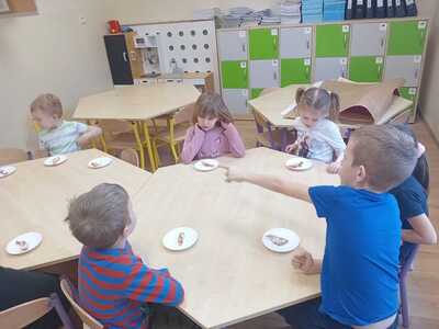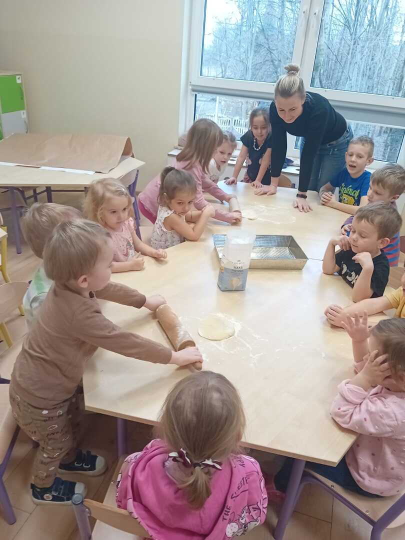 Karnawał to czas uczt i zabaw. Najhuczniej i najweselej obchodzimy „ostatki”, a przede wszystkim „Tłusty Czwartek”, który w naszym przedszkolu obchodziliśmy 8 lutego. Ten radosny dzień rozpoczęliśmy od przygotowywania składników na faworki. Przedszkolaki z wielką radością wsypywały mąkę, wbijały jajka, wyrabiały ciasto oraz wałkowały. Gotowe faworki zaniosły do kuchni, gdzie pani Ania usmażyła je. Następnie rozmawialiśmy o zdrowych i niezdrowych produktach oraz ustaliliśmy, że słodycze jedzone w nadmiarze są niezdrowe. Zobaczyliśmy także film edukacyjny „Tłusty Czwartek”, liczyliśmy pączki, dzieliliśmy słowa na sylaby oraz wykonaliśmy pracę plastyczną związana z tym wyjątkowym dniem. Na koniec każde dziecko zjadło pysznego pączka i samodzielnie zrobione faworki. Cały dzień był doskonałą okazją do świetnej zabawy oraz do przypomnienia i kultywowania naszych narodowych tradycji i zwyczajów.