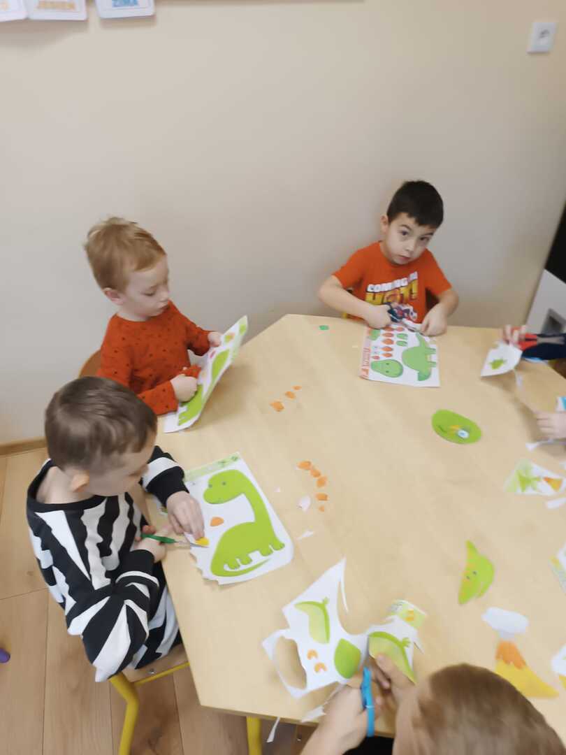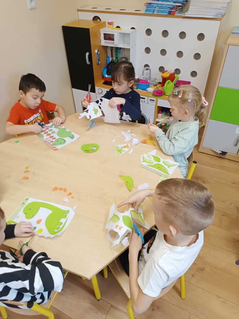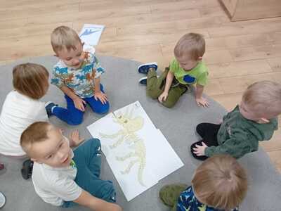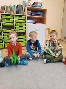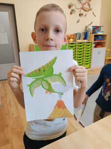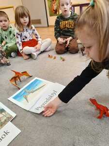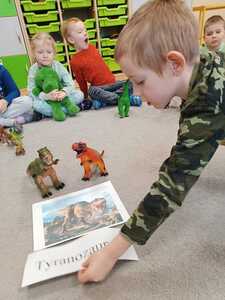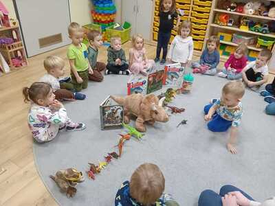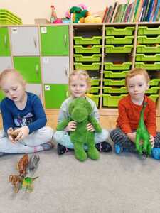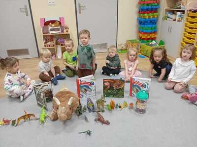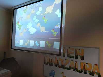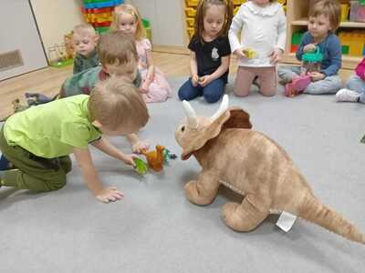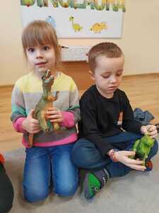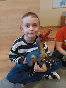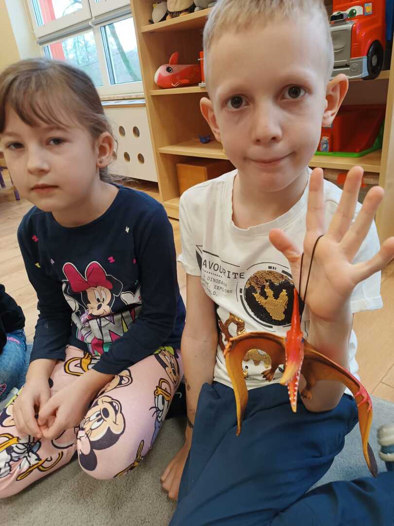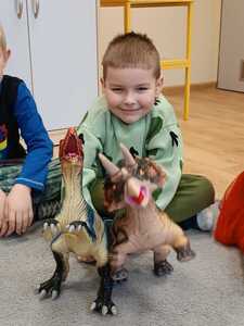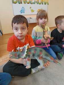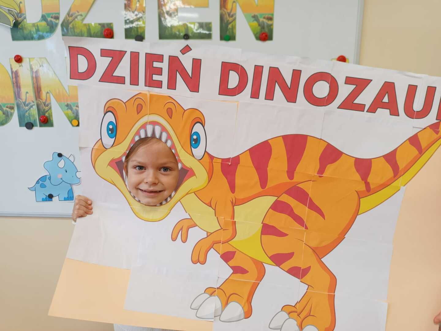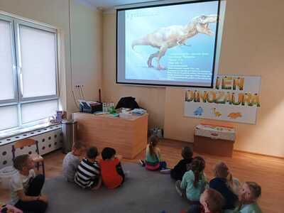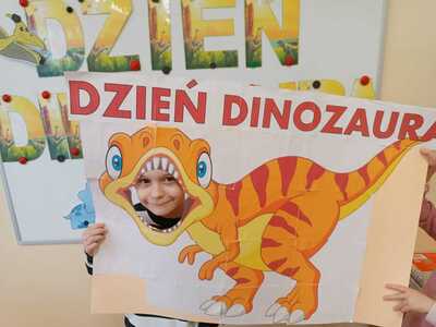19 lutego dzieci z naszego przedszkola obchodziły Dzień Dinozaura. Przedszkolaki „cofnęły” się w czasie przechodząc przez magiczną bramę do ery dinozaurów. Z tej okazji zobaczyły ciekawą prezentację oraz poznały kilka ciekawostek na temat tych dawnych stworzeń. Ponadto bawiły się w archeologów odkopując za pomocą pędzelków szkielet dinozaura. Odgadywały zagadki, brały udział w zabawach matematycznych oraz ruchowo-naśladowczych, układały puzzle oraz dinozaurowe memory. Podczas zajęć utrwaliły pojęcia z orientacji przestrzennej, wygląd dinozaura, kolory. Niewątpliwą atrakcją była dla dzieci możliwość zrobienia sobie zdjęcia w fotobudce oraz wykonanie ciekawych prac plastycznych np. T-Rexa z balona. Z pewnością były to dla przedszkolaków ciekawe zajęcia mające na celu poznanie przez nich czasów prehistorii.