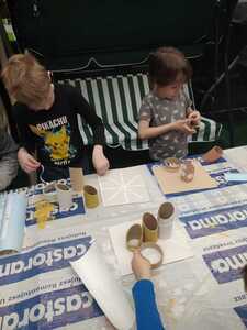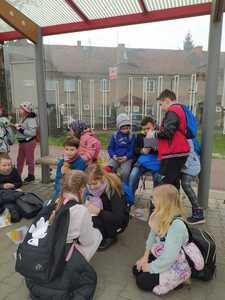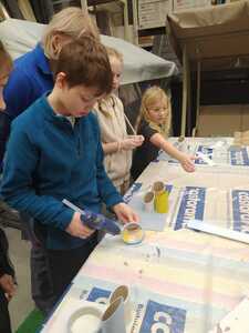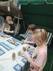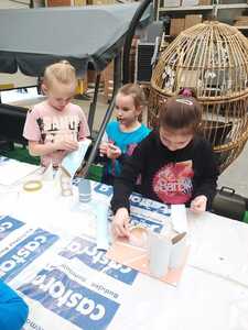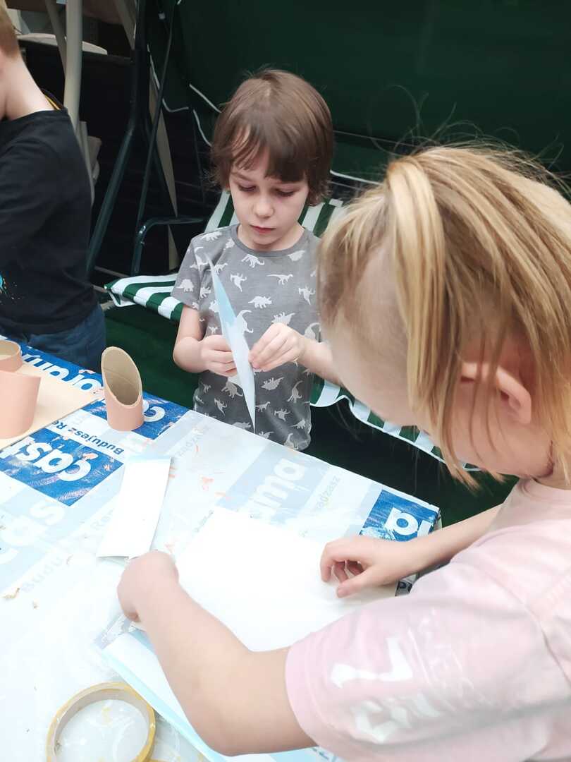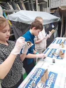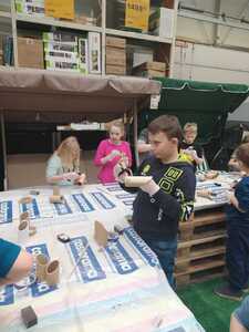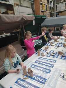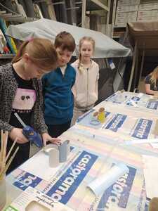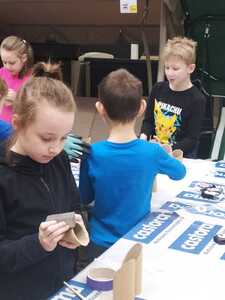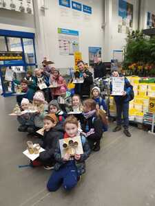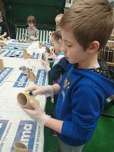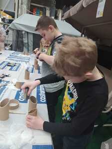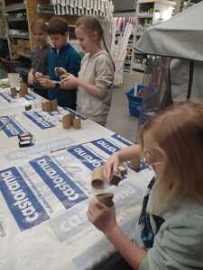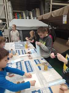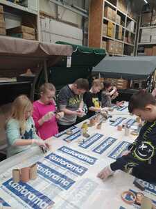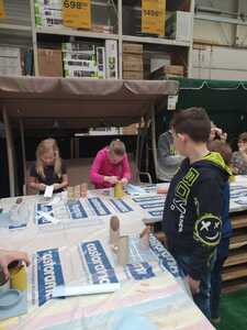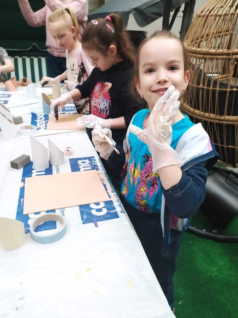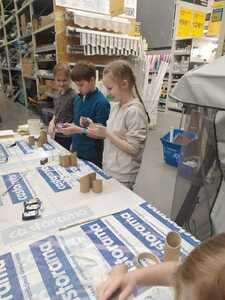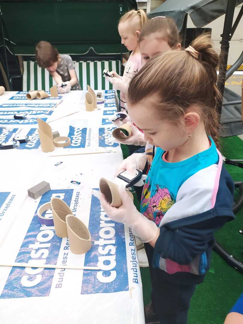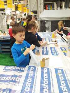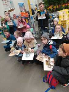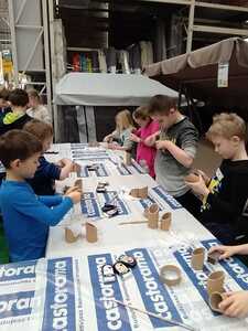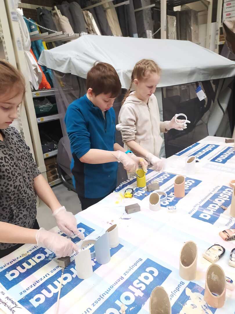 W dniu 11.03.2024r. klasa 1 i 3 były na wycieczce w Raciborzu. Pierwszym punktem programu były zajęcia pn. Majsterkowo” zorganizowane przez market budowlany Castorama. Dzieci miały za zadanie wykonać przybornik na biurko. Najpierw oszlifowały tuby z tektury za pomocą papieru ściernego, potem pomalowały je wg własnego pomysłu. Kolejnym etapem było pomalowanie podstawek i naklejenie na nie wyszlifowanych tub.