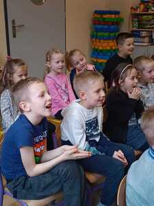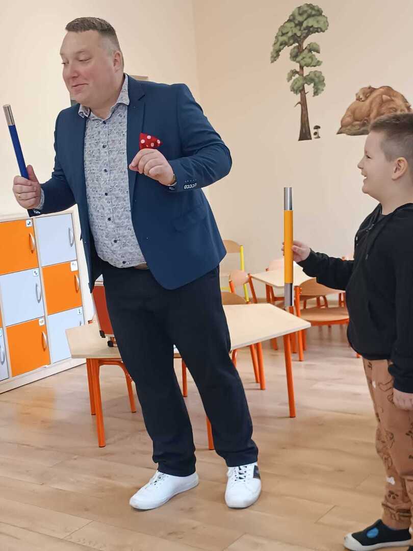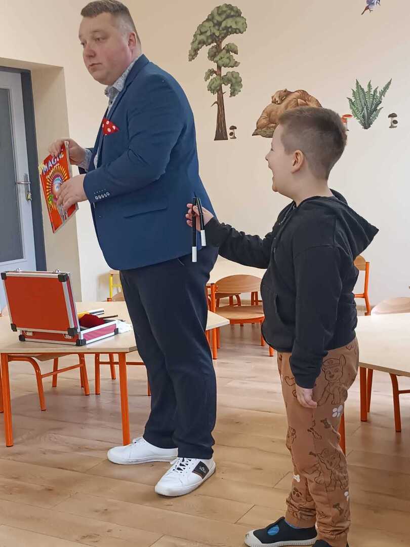 Dzień 14 marzec okazał się „ magicznym” dniem dla naszego przedszkola. Odwiedził nas bowiem Iluzjonista – Krystian Bączyński , który zgromadzonych widzów przeniósł we wspaniały świat iluzji, humoru i dobrej rozrywki. Na scenie działy się rzeczy niezwykłe! Iluzja pozwolił dzieciom chociaż na chwilę przenieść się w inny, zaczarowany świat. Sztuczki magiczne zapierały dech w piersiach i wywoływały zachwyt, ale także śmiech na twarzach przedszkolaków. W magiczny sposób pojawiały się i znikały przedmioty. Dzieci wypowiadały za czarodziejem magiczne zaklęcia, a wybrani asystenci osobiście brali udział w magicznych sztuczkach. Pokaz wzbudził szczery zachwyt u dzieci; „achom!” i „ochom!” nie było końca, mała widownia wprost nie mogła usiedzieć na swoich miejscach! Naszego niezwykłego gościa nagrodzono gromkimi brawami! Występ magika został zasponsorowany z części pieniążków, które udało nam się zebrać na świątecznym kiermaszu.