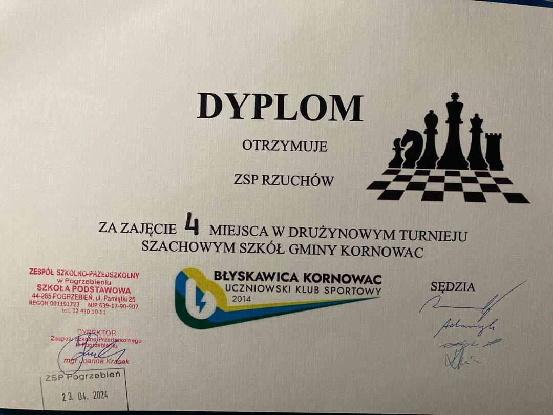 W myśl tej mądrości postępują szkoły Gminy Kornowac podtrzymując tradycję gry w szachy. Szachownice są dostępne w każdej ze szkół i uczniowie mają możliwość rozwijania swoich umiejętności. Najlepsi szachiści z każdej szkoły przystąpili do drużynowego turnieju szachowego w Zespole Szkolno- Przedszkolnym w Pogrzebieniu. Najlepszą drużyną turnieju okazali się uczniowie ZSP Kobyla, którzy zdobyli 5 punktów i uzbierali bilans małych punktów 20:4 dzięki czemu pokonali uczniów ze szkoły w Pogrzebieniu, którzy także uzbierali 5 punktów, ale mieli gorszy bilans małych punktów 16:8 zajmując drugie miejsce. Na 3 miejscu uplasowała się drużyna SP Kornowac, a na 4 pozycji ZSP w Rzuchowie. Uczniowie rozgrywali swoje partie pod presją czasu, dzięki profesjonalnym zegarom szachowym każdy zawodnik miał 5 minut na swoje ruchy, dzięki czemu rozgrywki były bardzo emocjonujące. Naszą szkołę reprezentowali: Lena Wyszkoń, Jakub Zarzycki, Dawid Kacorzyk i Paweł Grochowski.