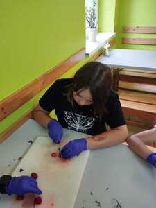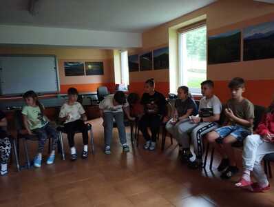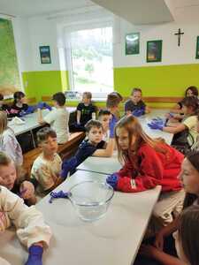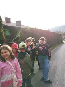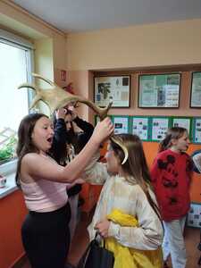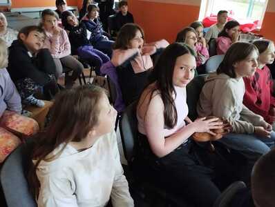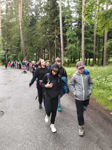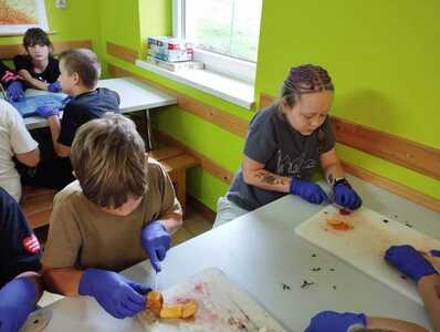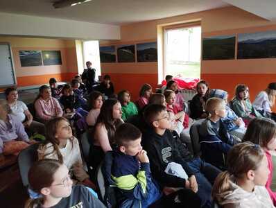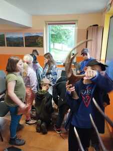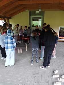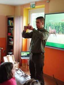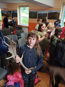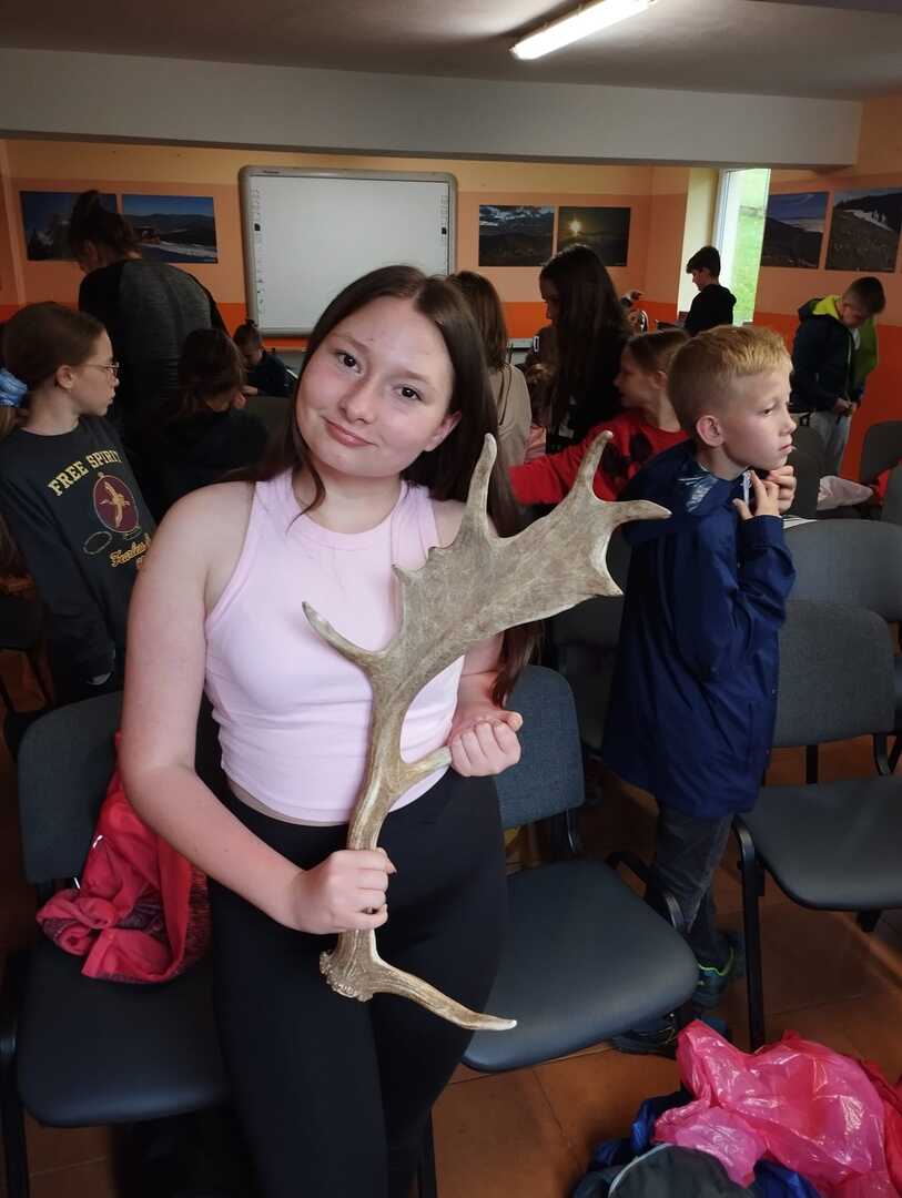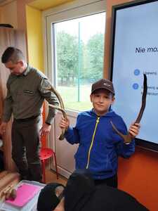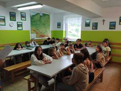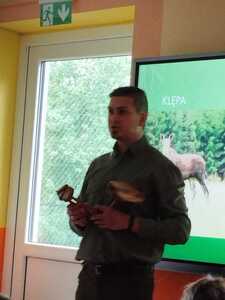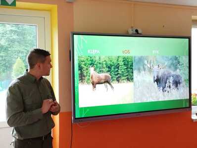 Po degustacji sałatki, ze względu na warunki pogodowe, uczniowie spotkali się z leśnikiem na terenie ośrodka, który jako ekspert w swojej dziedzinie, opowiedział o różnych gatunkach drzew, roślinach i zwierzętach zamieszkujących lasy.