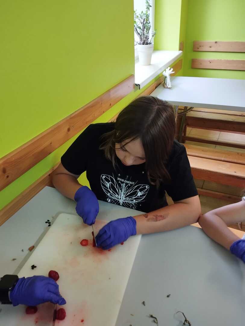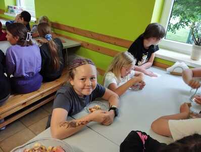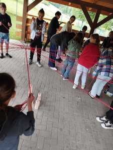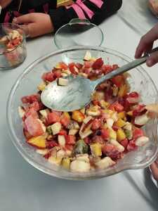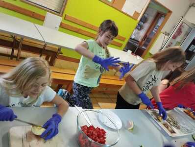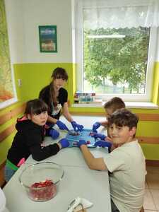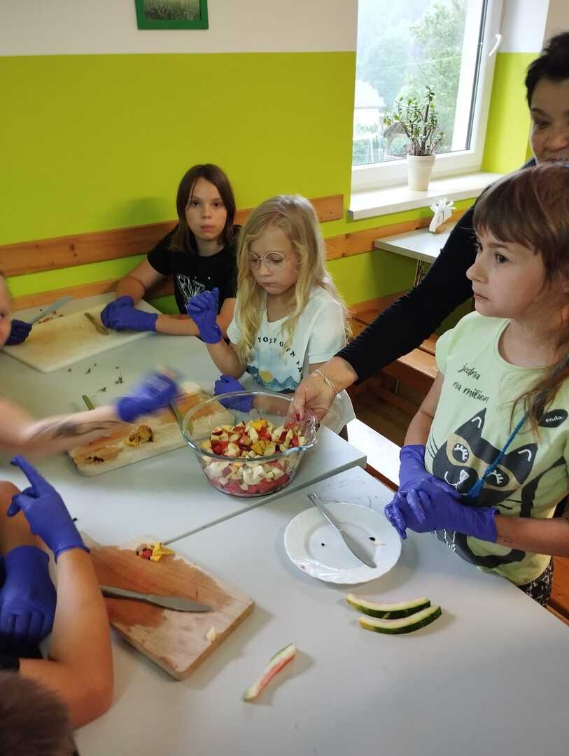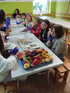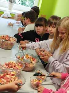 Po obiedzie był czas na kolejne zabawy integrujące o "owocowej" tematyce. Najpierw uczniowie brali udział w zabawie ruchowej "sałatka owocowa", następnie rozwiązywali zagadki o owocach, a na koniec wspólnymi siłami przygotowali sałatkę owocową na podwieczorek. Była to kolejna możliwość do integracji zespołu poprzez wspólne działanie, okazja do promowania zdrowego stylu życia i wprowadzania do diety większej ilości świeżych owoców.
