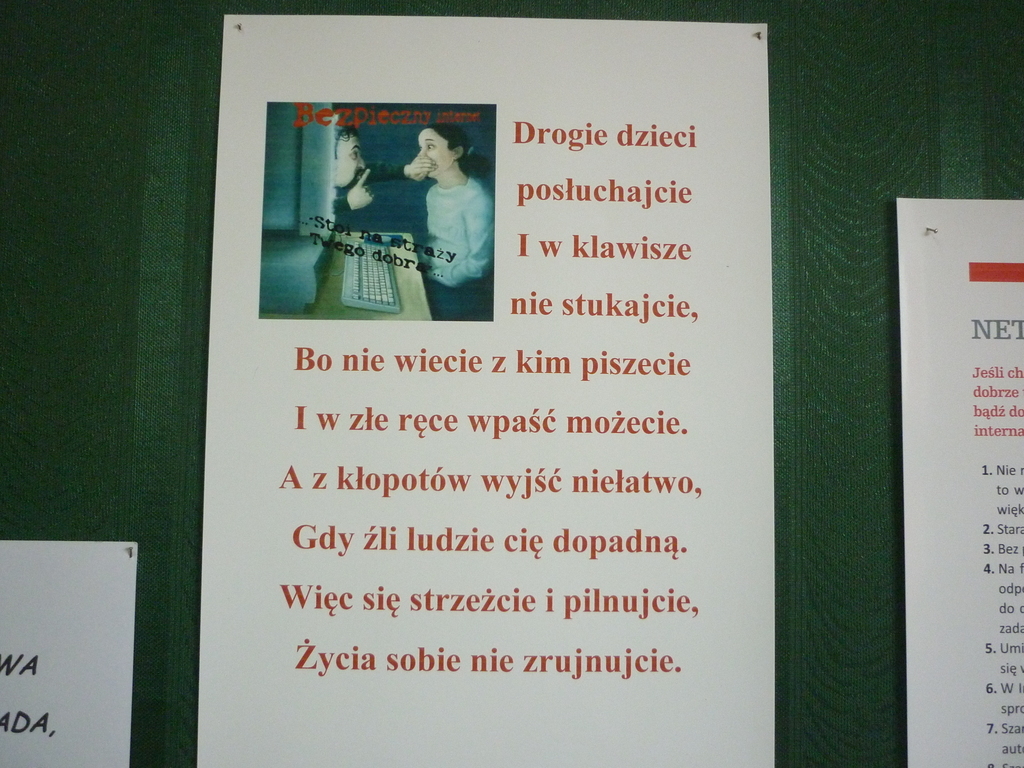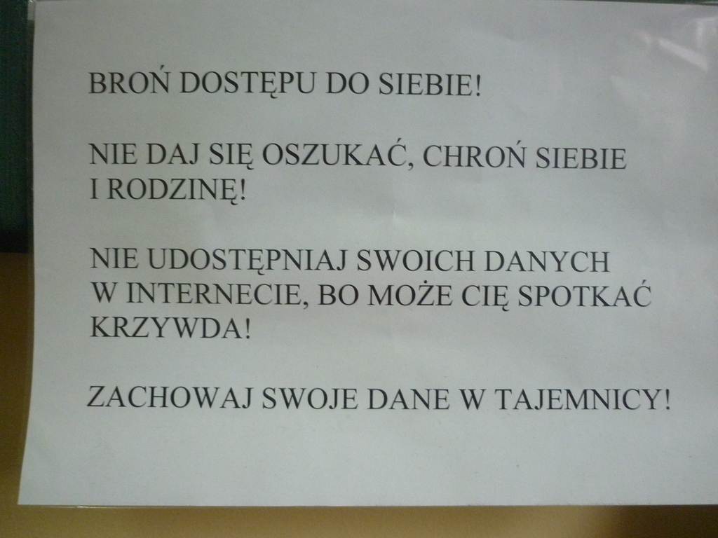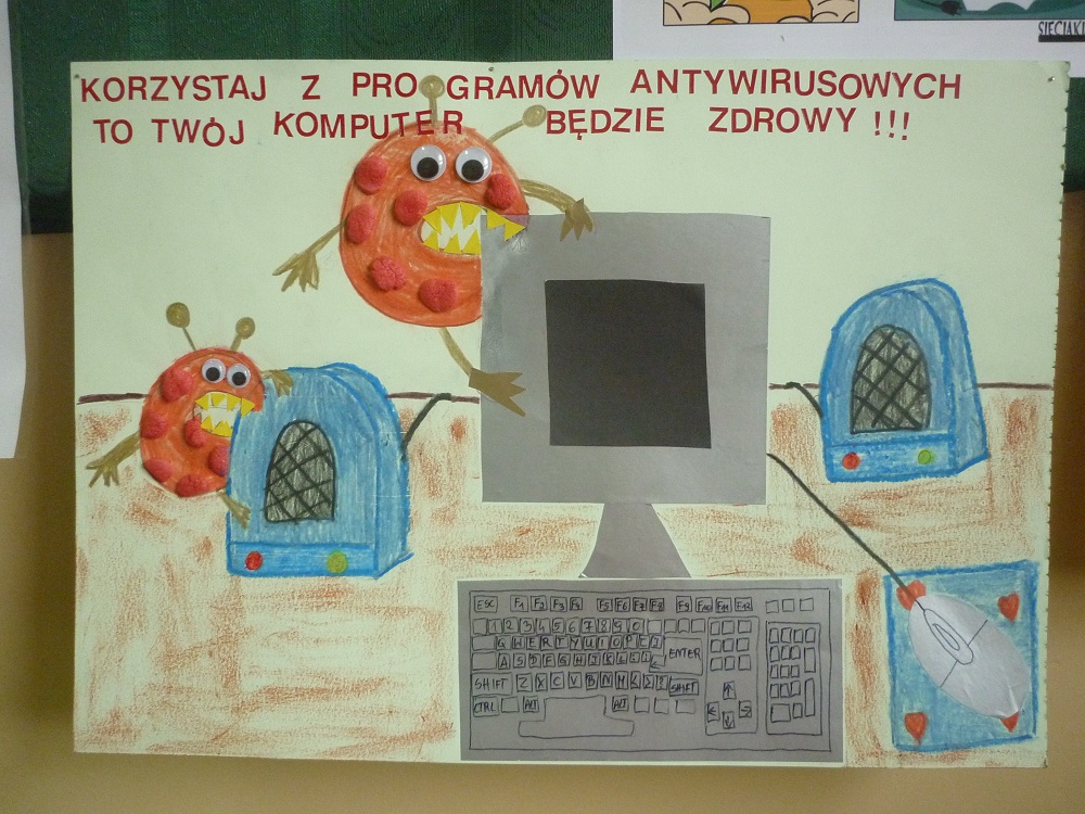 "BROŃ DOSTĘPU DO SIEBIE!" - to jedno z haseł promujących kolejne obchody "Dnia Bezpiecznego Internetu" w naszej placówce. Dlatego właśnie uczniowie klas I - III mieli ułożyć hasła mówiące o bezpieczeństwie w sieci. Oto one: Nie daj się oszukać, chroń siebie i rodzinę! Nie udostępniaj swoich danych w internecie, bo może cię spotkać krzywda! Zachowaj swoje dane w tajemnicy! Nie otwieraj stronki złej, bo to szkodzi i tobie i mnie! Twój przyjaciel antywirus zwalcza niewygodny wirus! Korzystaj z programów antywirusowych - twój komputer będzie zdrowy!Uczniowie klasy czwartej, wykorzystując program Paint, tworzyli plakaty o bezpiecznych zachowaniach w Internecie. Piątoklasiści pracowali nad komiksami, natomiast nasi najstarsi uczniowie wykonali prezentacje multimedialne o niebezpieczeństwach czyhających w sieci. Na korytarzu szkolnym wykonano gazetkę ścienną, na której między innymi znalazła się informacja o netykiecie, czyli zasadach dobrego zachowania obowiązujących w sieci.W związku z obchodami DBI grupa uczniów z klas IV-VI wzięła udział w konkursie organizowanym przez PPP w Raciborzu na wymyślenie hasła promującego ten dzień. Przeprowadzono pogadanki wzbogacone filmami edukacyjnymi dla dwóch grup wiekowych: klas I-III oraz klas IV-VI.Po feriach planowane jest spotkanie z policjantem, który przybliży dzieciom konsekwencje prawne niewłaściwego zachowania w Internecie.