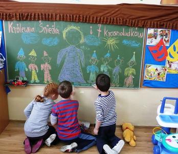 Baśnie i bajki są dla dzieci źródłem bogatych przeżyć i wrażeń, niezastąpionym sposobem wzbogacenia wyobraźni oraz pobudzania zainteresowania otaczającym światem. Mając więc na uwadze pozytywny wpływ literatury na rozwój dzieci, postanowiliśmy w drugim tygodniu ferii wybrać się w BAŚNIOWĄ PODRÓŻ DOOKOŁA ŚWIATA. Naszą podróż rozpoczęliśmy w poniedziałek od zaproszenia wszystkich do świata Kopciuszka. W tym dniu dziewczynki jako księżniczki, a chłopcy jako rycerze, udali się do przedszkolnego kina, aby obejrzeć bajkę „Kopciuszek”. Następnie przenieśliśmy się na salę gimnastyczną, gdzie odbył się „Turniej Rycerki”. Po wyczerpujących ćwiczeniach przedszkolaki miały szansę odpocząć podczas rysowania zamku na komputerze w programie paint. We wtorek wszystkie dzieci zamieniły się w kotki, które wspólnie z nauczycielem opowiedziały bajkę „Kot w butach” oraz wykonały smakowite myszki z sera. W środę cały dzień spędziliśmy z Czerwonym Kapturkiem, gdzie po obejrzeniu bajki wykonaliśmy maskę wilka, układaliśmy puzzle, rysowaliśmy obrazki. W czwartek poznaliśmy losy „Jasia i Małgosi”, stworzyliśmy domek Baby – Jagi, bawiliśmy się w teatr oraz wykonaliśmy drewniane pacynki. Naszą baśniową podróż zakończyliśmy w piątek w domku siedmiu krasnoludków, które wspólnie z Królewną Śnieżką zorganizowały dla nas konkurs wiedzy pt: „Czy znamy te baśnie?”. I tak drugi tydzień ferii dobiegł końca. Mimo że były one śnieżne i można było korzystać z wielu uroków zimy, to dzieci z ochotą przychodziły do przedszkola, by wesoło spędzić czas w gronie kolegów i koleżanek.