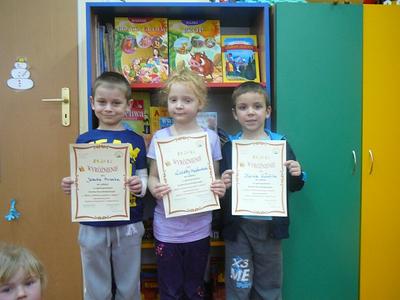 Wielka radość zapanowała w przedszkolu w Rzuchowie na wieść o zajęciu przez dzieci znaczących miejsc oraz zdobyciu wyróżnień w ostatnich konkursach. Pięcioletnia Klaudia Gosek zajęła pierwsze miejsce w ogólnopolskim konkursie "Ocalić od zapomnienia - wiersze, piosenki, baśnie i bajki naszych dziadków". Pięcioletni Patryk Kampka zdobył trzecie miejsce w wojewódzkim konkursie plastycznym pt. "Świąteczny bałwanek". Karol Gołofit (4 lata), Wioletta Hajduczek (5 lat), Jakub Mrozek (6 lat) otrzymali wyróżnienia w ogólnopolskim konkursie plastycznym pt. "Moja ulubiona postać z bajki", gdzie, jak poinformowali organizatorzy, napłynęło 226 prac . Serdecznie gratulujemy wszystkim nagrodzonym i wyróżnionym przedszkolakom oraz życzymy im dalszych sukcesów.