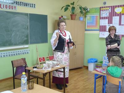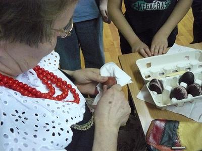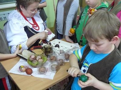 Zdobienie jajek to nieodłączny element świąt wielkanocnych. W języku potocznym utarło się, że wszystkie dekorowane jajka nazywamy pisankami. Nic bardziej mylnego, bo ze względu na wybraną technikę zdobniczą mamy: naklejanki, drapanki, rysowanki, pisanki i skrobanki. Sztuka dekorowania jajek na Wielkanoc jest bardzo ciekawa i interesująca. W związku z tym postanowiliśmy, w ramach spotkań z ciekawymi ludżmi - pasjonatami, zorganizować zajęcia warsztatowe dla klas I-III. W spotkaniu wzięła udział Pani Elżbieta Kawulok, która w bardzo ciekawy i przystępny sposób zaprezentowała sztukę zdobienia jajek metodą rytowniczą. Jak się okazało, taki sposób dekorowania nie jest taki łatwy, wręcz wymaga dużego skupienia, cierpliwości, pomysłowości i czasu. W trakcie pokazu uczniowie mieli okazję zapoznać się z całą otoczką przygotowań, sposobem wykonania zdobionych jajek, poznali przyrządy, którymi się posługują twórcy, a także samodzielnie mogli popróbować tej sztuki. Dzieci przekonały się, że jest to niełatwa praca, ale w efekcie daje przepiękne dzieła, o czym mogliśmy się wszyscy przekonać podziwiając prace gościa. Spotkanie to było również atrakcyjne dzięki temu, że Pani Elżbieta miała na sobie regionalny śląski strój ludowy. Dzieci były bardzo zadowolone ze spotkania, a na zakończenie złożyły podziękowania za ciekawą lekcję, udział w zajęciach oraz wspaniałą atmosferę.