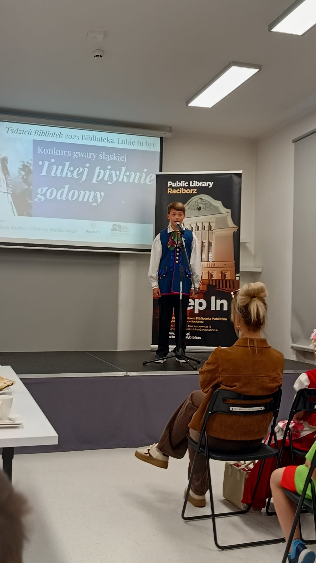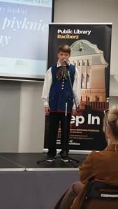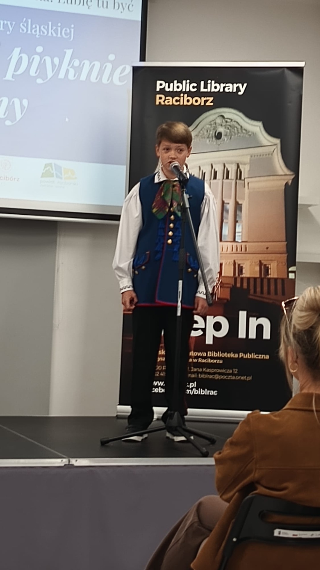 Rezprezentantem naszej szkoły w konkursie był uczeń klasy czwartej Aleksander Pilch, który wygłosił monolog „Śląskie tradycje w moim domu”. Olek opowiedział w języku regionalnym o zwyczajach obchodzonych w śląskiej rodzinie. Aleksander w swojej kategorii zdobył II miejsce. Bardzo się cieszymy z wyniku Olka, serdecznie mu gratulujemy wspaniałego występu i życzymy kolejnych sukcesów w konkursach.