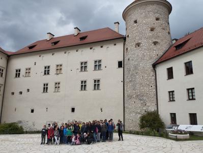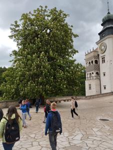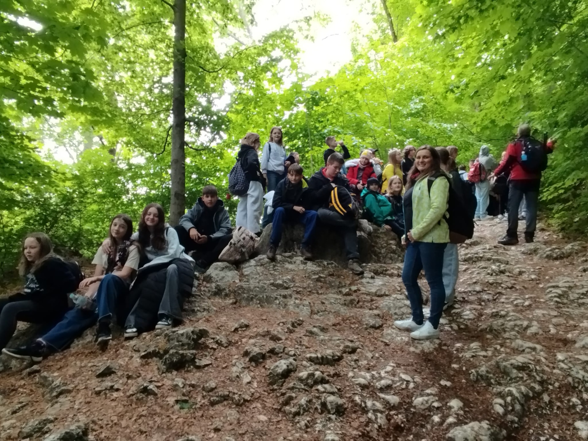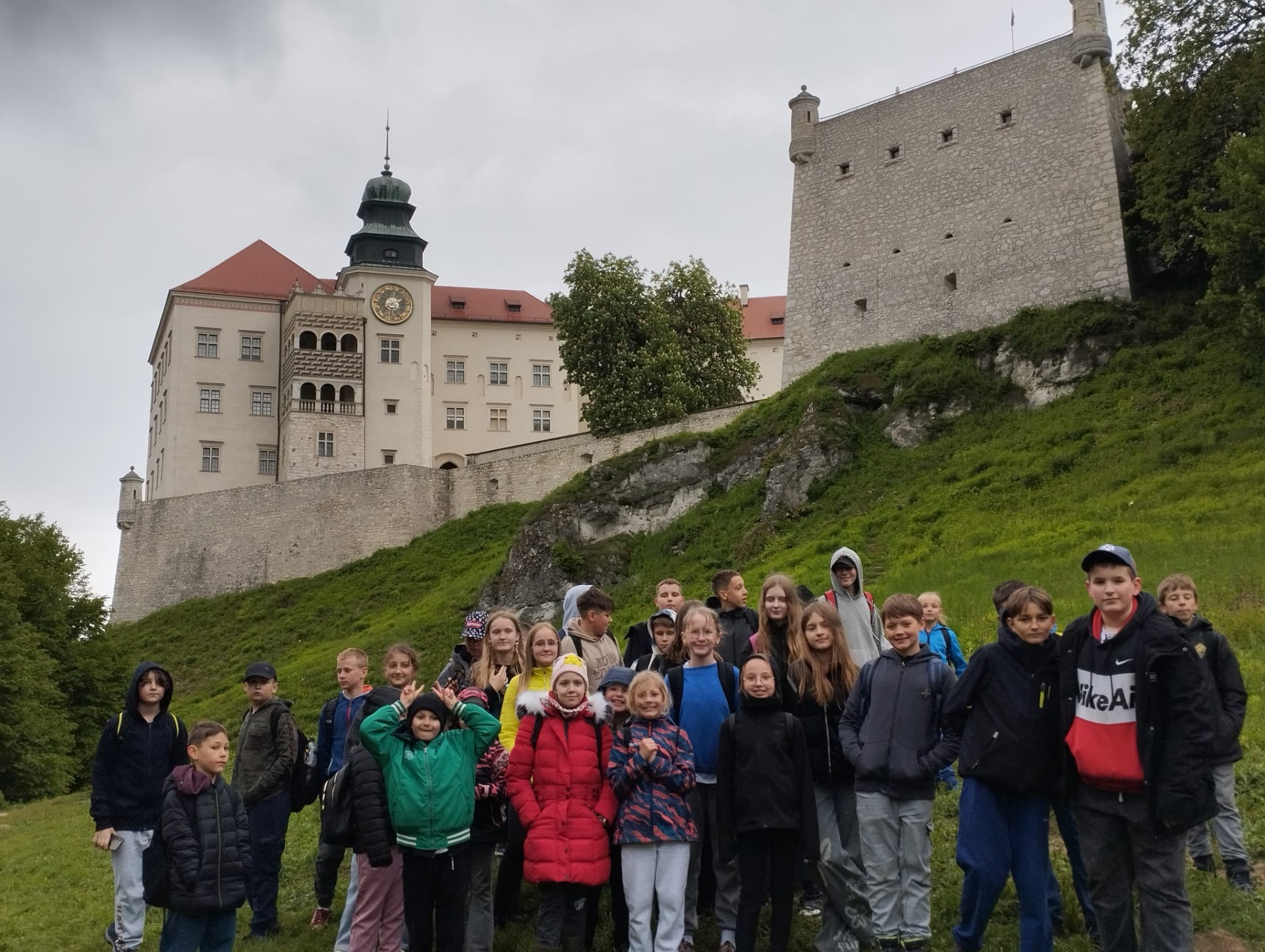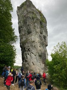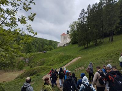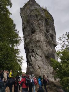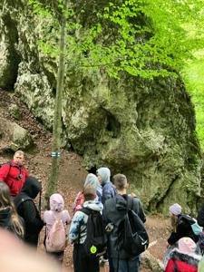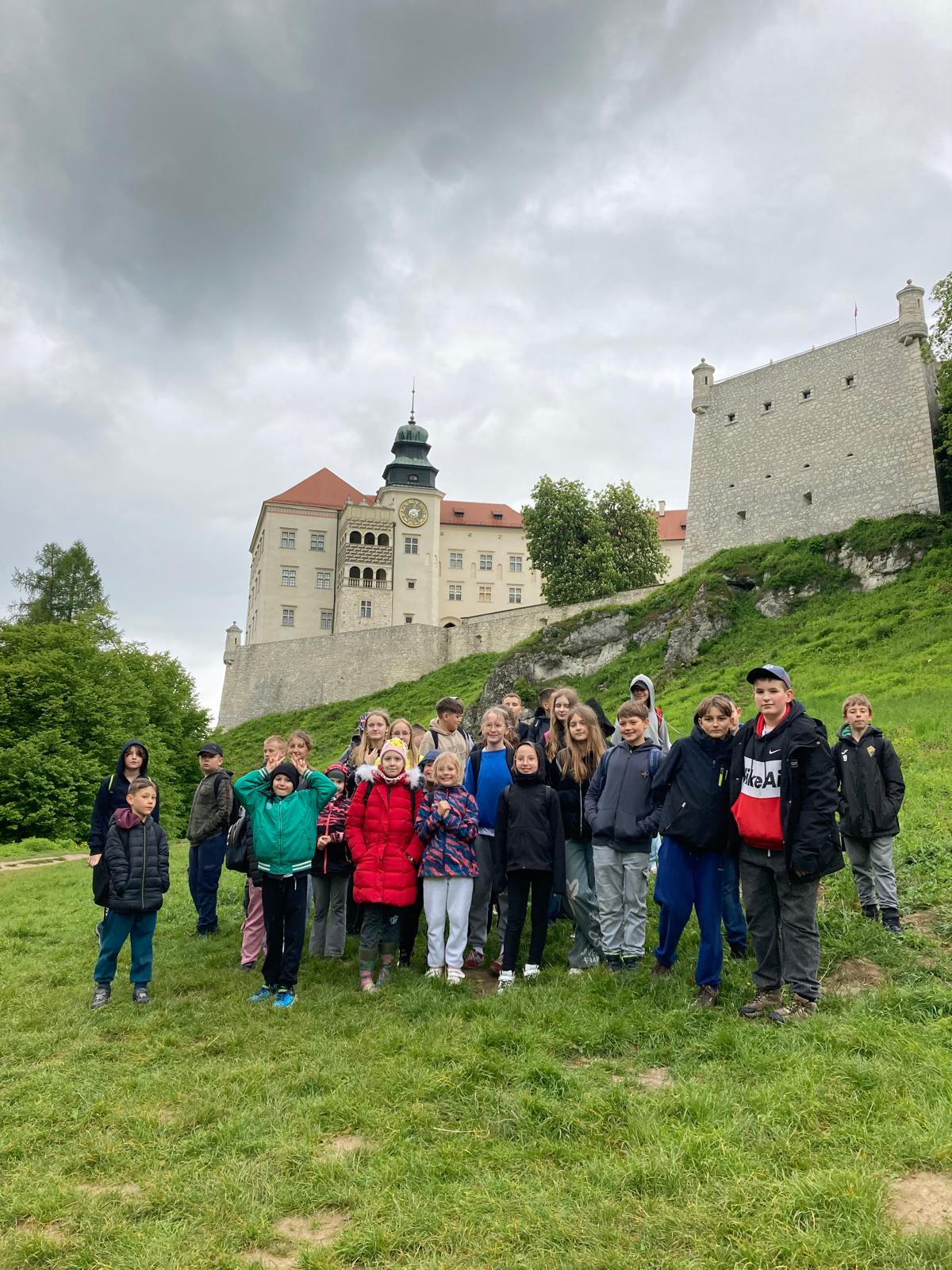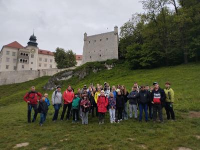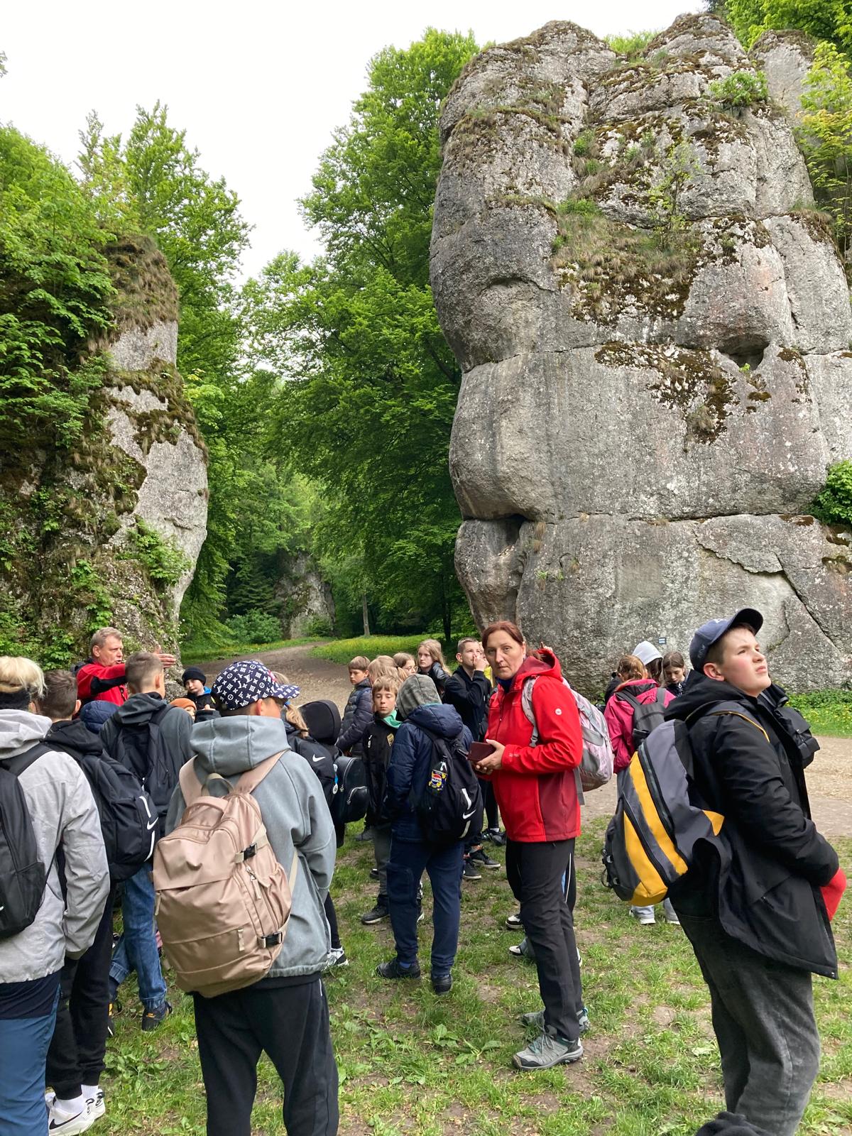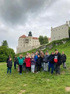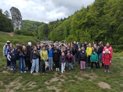 W piątek, 16 maja, uczniowie klas 2, 4, 5, 6 i 7 wzięli udział w niezwykle ciekawej wycieczce do Ojcowskiego Parku Narodowego – jednego z najpiękniejszych i najciekawszych przyrodniczo obszarów Wyżyny Krakowsko–Częstochowskiej. Naszą wędrówkę rozpoczęliśmy w Dolinie Prądnika, prowadzącej do największej jaskini w parku – Jaskini Łokietka. Podczas zwiedzania poznaliśmy nie tylko piękno form naciekowych, ale także legendę o ukrywającym się w niej Władysławie Łokietku. Na trasie naszej wycieczki znalazły się również słynne formy skalne: Wąwóz Ciasne Skałki, Brama Krakowska oraz najbardziej rozpoznawalna – Maczuga Herkulesa. Zobaczyliśmy także urokliwą Kaplicę na Wodzie, zbudowaną na potoku Prądnik. Kolejnym punktem naszej wyprawy była Pieskowa Skała – jeden z najbardziej znanych zamków w Polsce, który wielokrotnie pojawiał się w filmach i serialach. Zwiedziliśmy oba dziedzińce zamku, podziwiając jego architekturę i położenie. Wycieczka była dla wszystkich uczestników nie tylko okazją do aktywnego spędzenia czasu na świeżym powietrzu, ale także lekcją przyrody, historii i geografii w terenie. Wróciliśmy pełni wrażeń, z nową wiedzą i uśmiechami na twarzach.