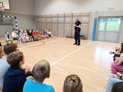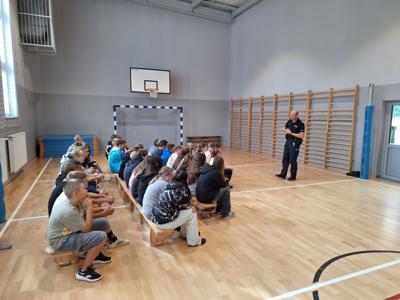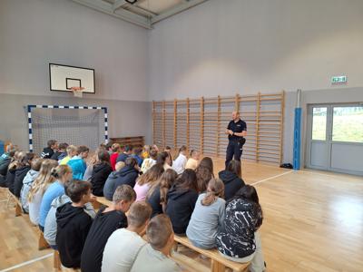 10 września gościliśmy w szkole naszego dzielnicowego pana Kazimierza Kruczka. Funkcjonariusz policji na spotkaniach z naszymi uczniami przypomniał podstawowe zasady uczestnictwa w ruchu drogowym. Policjant poruszył także niezwykle ważny problem poruszania się w sposób niebezpieczny na hulajnogach elektrycznych. Nasi uczniowie zostali poinformowani o potencjalnych konsekwencjach za użytkowanie hulajnóg w sposób niezgodny z przepisami. Zwrócono szczególnie uwagę na konieczność posiadania kasku w celu zapewnienia należytego bezpieczeństwa. Na koniec spotkania był czas na zadawanie pytań w celu rozwiania wszelkich wątpliwości.