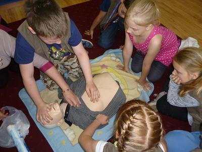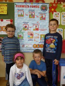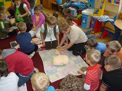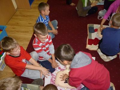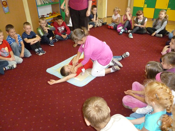 „Mali ratownicy” – zajęcia z zakresu udzielania pierwszej pomocy Często w sytuacjach zagrożenia nie wiemy, jak się zachować i jak pomóc osobie poszkodowanej, gdyż boimy się i nie posiadamy odpowiednich umiejętności. Takie sytuacje mogą zdarzyć się każdemu, także dzieciom. Z myślą o tym, nauczycielki Henrieta Fojcik i Marta Godawa przygotowały i przeprowadziły 22 maja zajęcia z udzielania pierwszej pomocy. Głównym celem zajęć było kształtowanie otwartej postawy na pomoc drugiemu człowiekowi. W zajęciach uczestniczyły dzieci z przedszkola oraz uczniowie klasy II. Podczas zajęć dzieci oglądały film animowany „Doktor Kręciołek”, dzięki któremu dowiedziały się, jak zachować się w razie wypadku oraz jak wezwać pomoc. Nauczyły się także podstawowych numerów alarmowych, dowiedziały się, jak ustalić czynności życiowe poszkodowanego oraz zapoznały się z nowym słownictwem, takim jak: resuscytacja krążeniowo - oddechowa, pozycja bezpieczna. Jednak największym zainteresowaniem cieszyły się zajęcia praktyczne z fantomem, podczas których to dzieci wykonywały masaż serca i sztuczne oddychanie. Zarówno przedszkolakom jak i uczniom kl. II bardzo podobały się zajęcia i aktywnie brały w nich udział.