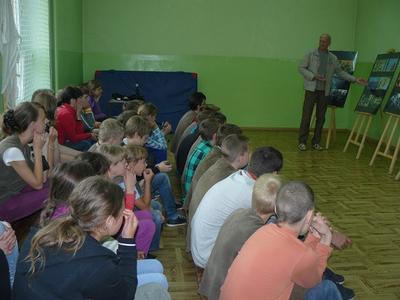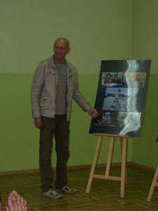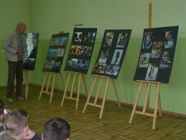 W pierwszym spotkaniu wziął udział Pan Jerzy  Kawulok, pasjonat - fotograf, autor licznych wystaw i galerii prac fotograficznych; członek grupy fotograficznej ,,Indygo"i grupy artystycznej ,,Konar". Autor zaprezentował ciekawą kolekcję zdjęć pt. ,,Kraina Dzieciństwa", w której tematyka nawiązywała do minionego Dnia Dziecka. W czasie prelekcji gość opowiadał o różnych zdarzeniach zarejestrowanych w kadrze w czasie robienia zdjęć, zapoznał dzieci ze sprzętem i zasadami wykonywania fotografii, a uczniowie mogli zadawać pytania i brać udział w dyskusji. Pan Jerzy zaproponował uczniom udział w konkursie na zrobienie najładniejszego pejzażu okolic Rzuchowa. Dzieci bardzo żywo zareagowały i chętnie zgłosiły udział w zabawie, tym bardziej, że najciekawsze prace zostaną przez prowadzącego nagrodzone. Na zakończenie dzieci wykonały liczne zdjęcia przyniesionymi aparatami, podziękowały prelegentowi, wręczając własnoręcznie wykonane prace plastyczne i drobne upominki.