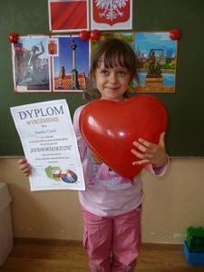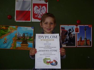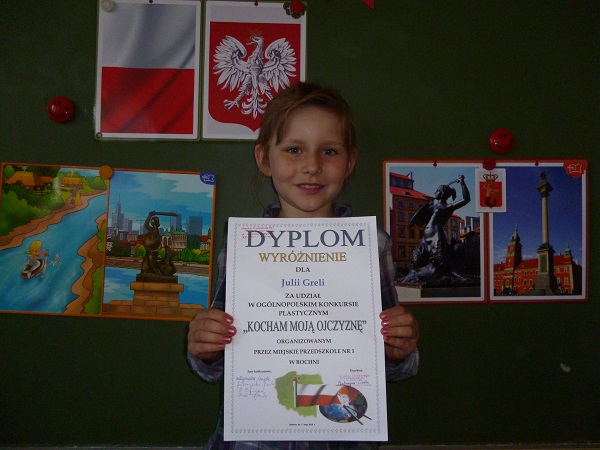W ramach wychowania patriotycznego dziecko kończące przedszkole dowiaduje się, jakiej jest narodowości, wie, że mieszka w Polsce, a stolicą Polski jest Warszawa. Powinno też wiedzieć, jak wygląda godło oraz flaga Polski. W maju zwracaliśmy uwagę na rozwijanie u dzieci poczucia przynależności narodowej. Dzieci stosowały zwroty: "Jestem Polakiem. Mieszkam w Polsce. Mówię po polsku." Przedszkolaki poznawały legendy, opowiadania, wiersze dotyczące historii państwa polskiego, poznały pochodzenie nazwy stolicy Polski - Warszawy. Nazywały też największe rzeki Polski i wskazywały je na mapie. Przy tej okazji ułożyły wiersz na ogólnopolski konkurs artystyczny "W nadwiślańskim grodzie" do Płocka oraz wykonały prace plastyczne na ogólnopolskie konkursy "Moja flaga jest biało-czerwona" do Polkowic oraz "Kocham moją ojczyznę" do Bochni. W tym konkursie Julia Grela oraz Sandra Cieśla zdobyły wyróżnienia i otrzymały nagrody.