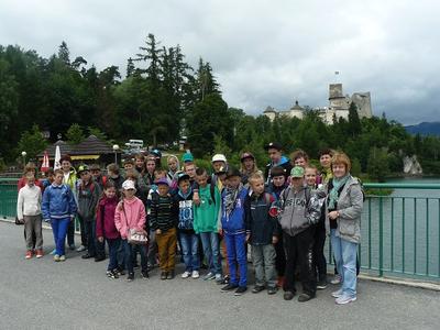 W następnym dniu pojechaliśmy na cały dzień w Pieniny. Po nocnej ulewie pogoda zapowiadała się dobrze, więc ciekawi kolejnych wrażeń udaliśmy się w drogę. W czasie jazdy Pani przewodnik w bardzo ciekawy i przystępny sposób podawała istotne informacje wzbogacając je humorystycznymi anegdotami. Przez szyby autokaru podziwialiśmy piękne widoki i krajobrazy górskie. Dotarliśmy do miejscowości Dębno, gdzie zwiedziliśmy przepiękny modrzewiowy kościół pod wezwaniem św. Michała Archanioła- zabytek klasy zerowej. Kolejną atrakcją było zwiedzanie zapory wodnej na Dunajcu, skąd spacerkiem udaliśmy się na zamek w Niedzicy. Z uwagą słuchaliśmy legend i ciekawostek o tym miejscu, tym bardziej, że więziony tu był sam Janosik. Kolejnym punktem wycieczki było dotarcie pod szczyt Trzech Koron, a następnie dojazd do Szczawnicy. Tu mogliśmy odsapnąć i zakupić dla siebie oraz bliskich pamiątki. Zmęczeni, ale zadowoleni i ze śpiewem na ustach wróciliśmy na miejsce noclegowe. Po obiadokolacji mogliśmy popróbować swych umiejętności w rękodziele artystycznym - malowaniu na szkle. Wyszły nam ciekawe prace. Finałem tego dnia, a zarazem elementem pożegnalnym, była dyskoteka, na której wszyscy wyśmienicie się bawili.