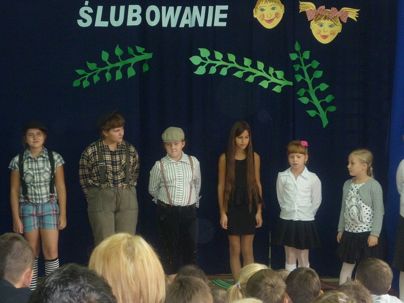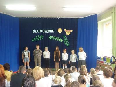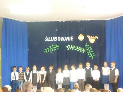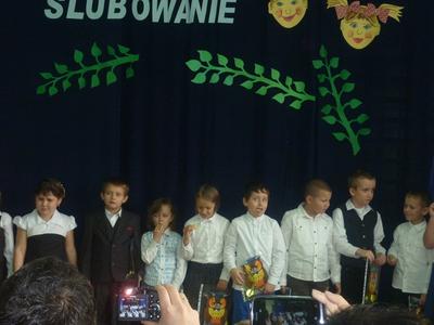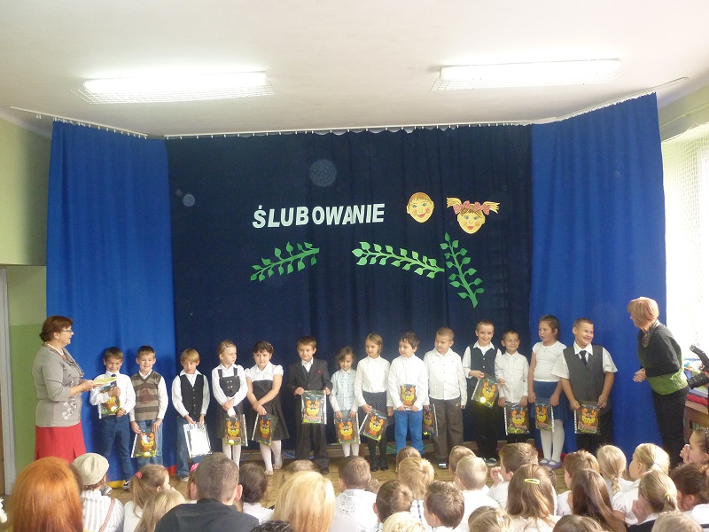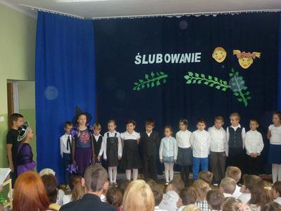 14 pażdziernika 2013r. był szczególnym dniem dla najmłodszych uczniów Szkoły Podstawowej w Rzuchowie, gdyż zostali przyjęci w poczet braci szkolnej. W tym roku przysięgę złożyło czternaścioro uczniów. Od wczesnych godzin wśród wszystkich uczniów i zaproszonych gości panowała odświętna i podniosła atmosfera. Na początku uroczystości w ciepłych słowach do wszystkich zgromadzonych na sali zwróciła się pani dyrektor Wanda Knura. Kolejnym punktem programu był występ uczniów klasy I, do którego przygotowywali się bardzo starannie i rzetelnie. Przedstawili się od najlepszej strony - recytowali wiersze, śpiewali poznane piosenki oraz dzielnie odpowiadali na pytania starszych kolegów. Póżniej pierwszoklasiści złożyli uroczyste ślibowanie. Po przyrzeczeniu wychowawczyni klasy I symbolicznym ołówkiem dokonała pasowania każdego dziecka na ucznia szkoły podstawowej. Było to wielkie przeżycie zarówno dla uczniów klasy I, rodziców, jak i całej społeczności szkolnej. Na pamiątkę od wychowawcy dzieci otrzymały Dyplom Pasowania na Ucznia i długopisy, a od rodziców zawieszki na kluczyki i światełka odblaskowe. W uroczystości brała udział także delegacja naszego przedszkola z wychowawczynią panią Martą Godawa. Przedszkolaki z wielkim zaciekawieniem obserwowały poczynania swych starszych kolegów, a największe wrażenie zrobiło na nich zjedzenie przez uczniów klasy I ,,kwaśnej cytrynki"- symbolu zdania egzaminu na ,,pierwszaka".