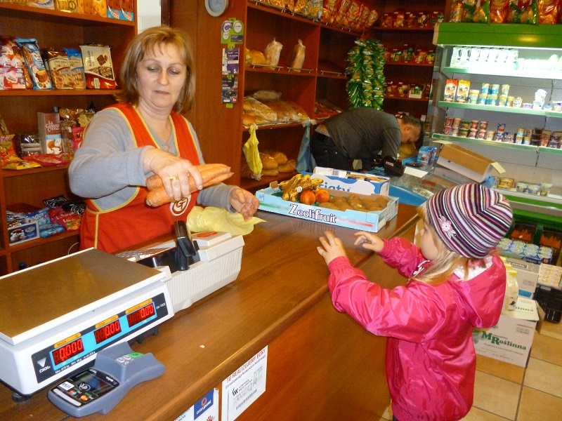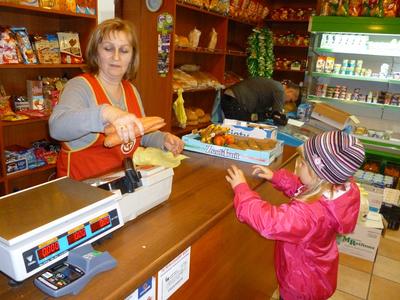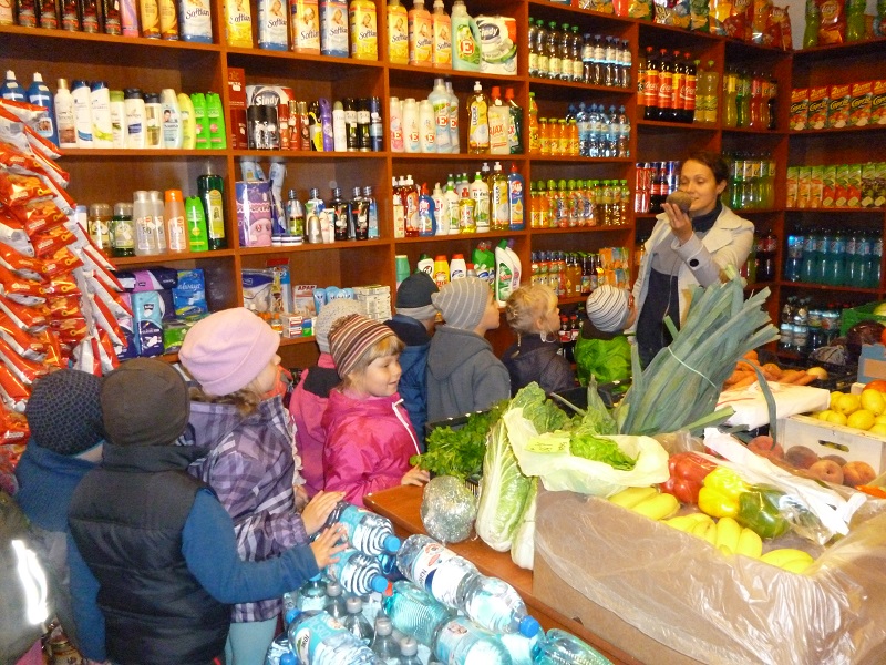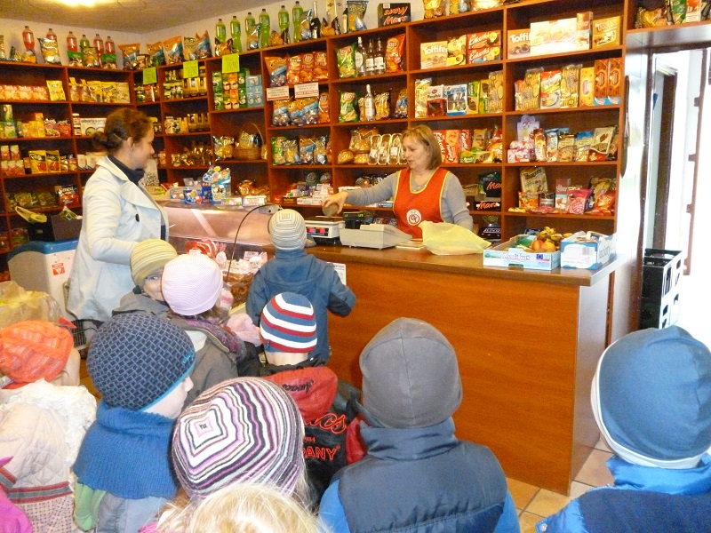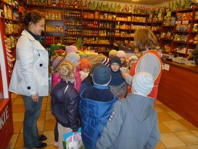 19 października przedszkolaki z Rzuchowa wybrały się do pobliskiego sklepu spożywczego. Głównym celem naszej wycieczki było zapoznanie dzieci z pracą sprzedawcy oraz wyposażeniem sklepu. W sklepie przedszkolaki z zainteresowaniem oglądały wszystkie regały, półki, lodówki, kasę fiskalną oraz wagę elektroniczną. Ponadto dzięki uprzejmości pani ekspedientki dowiedziały się, na czym polega jej praca, poznały różne rodzaje artykułów sprzedawanych w tym sklepie oraz utrwaliły nazwy warzyw i owoców. Na zakończenie wycieczki dokonaliśmy drobnych zakupów, za które zapłaciliśmy, odebraliśmy resztę i paragon. Pamiętaliśmy także o stosowaniu form grzecznościowych: "proszę i dziękuję". Na pamiątkę naszej wizyty wręczyliśmy pani ekspedientce laurkę, a ona zrewanżowała się nam lizakami. Wizyta w sklepie była bardzo ciekawa i pouczająca.