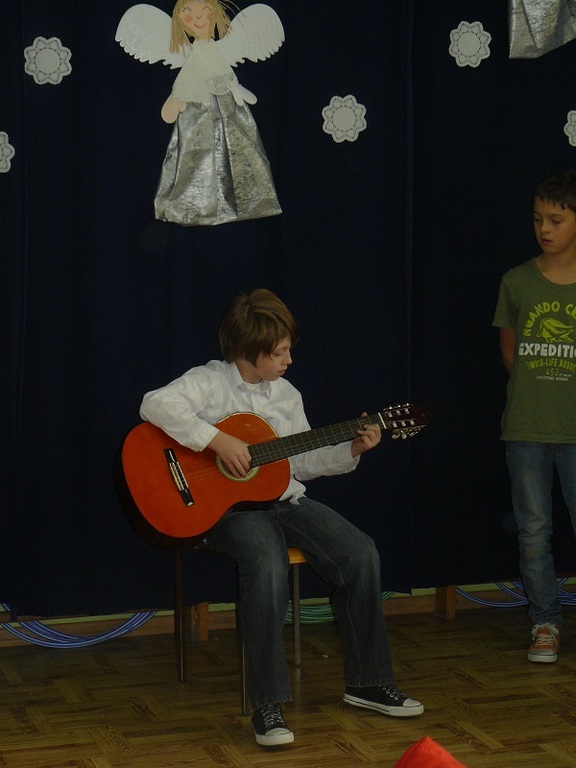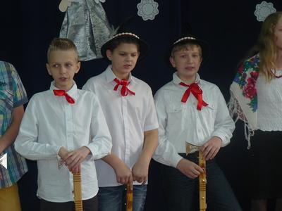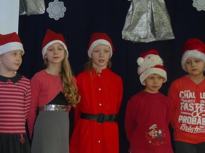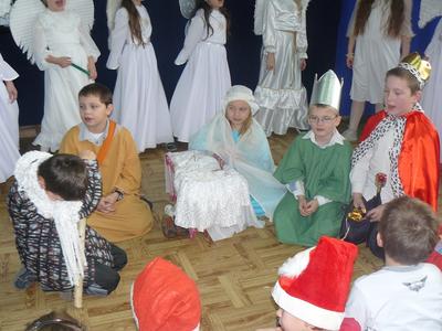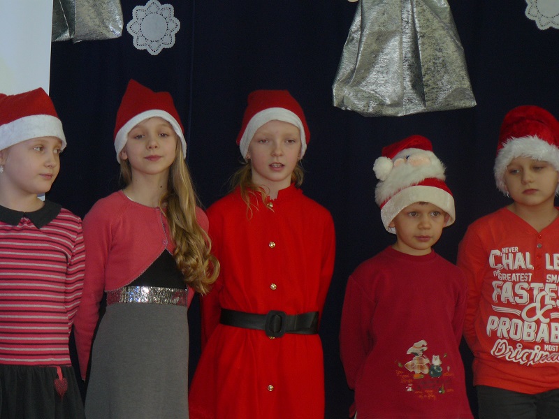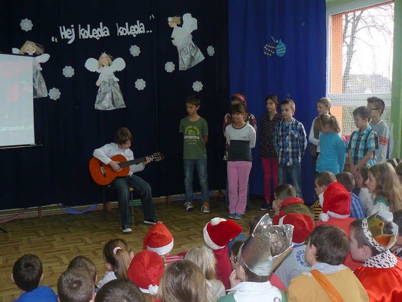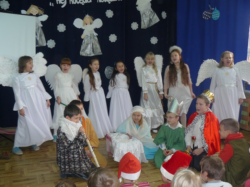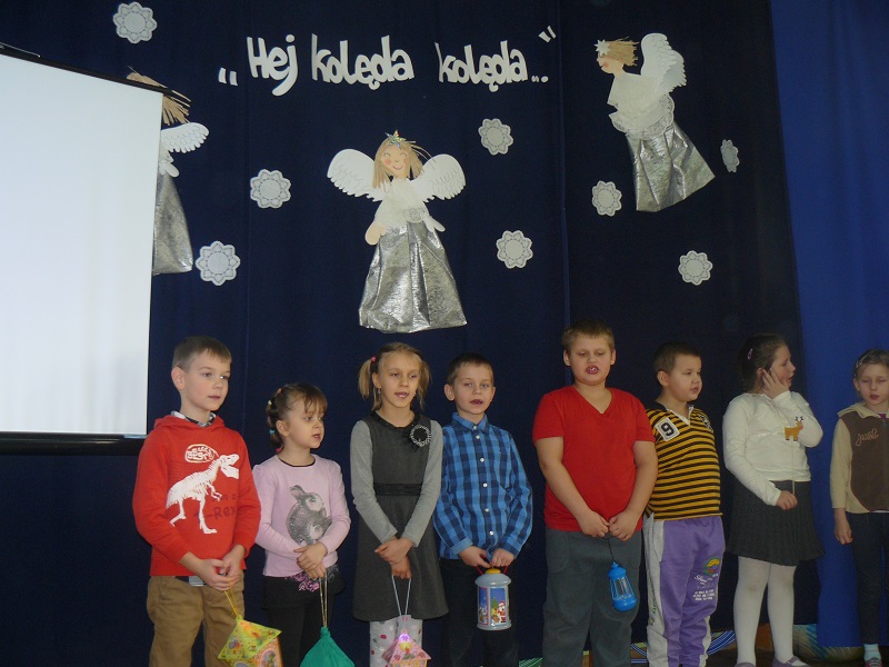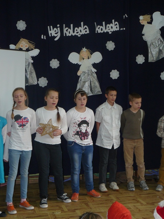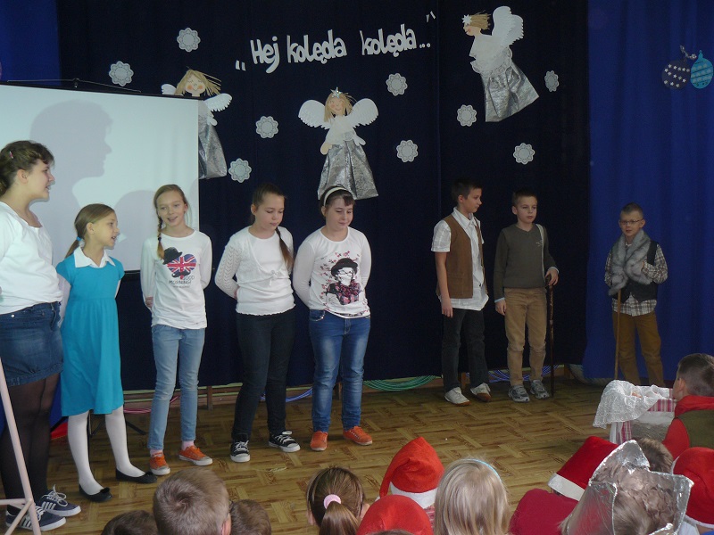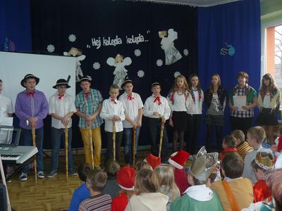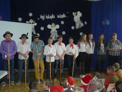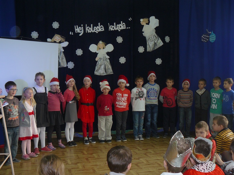 Okres Świąt Bożego Narodzenia to czas radosnego oczekiwania i czas wspólnego kolędowania. Kolędy od wieków rozbrzmiewały w polskich kościołach i domach, nie zabrakło ich również w naszej szkole. W ostatnim przedświątecznym dniu nauki 20 grudnia 2013r. uczniowie wraz z nauczycielami przygotowali urocze pastorałki i kolędy pochodzące z domowych śpiewników. Niektóre z nich tradycją sięgały czasów XV i XVI wieku, a kilka miało charakter bardziej współczesny. W repertuarze najmłodszych wykonawców znalazły się kolędy: „ O Mikołaju ” i „Świecąca gwiazdka”. Klasa druga przygotowała „Świetlistą kolędę”, zaś trzecioklasiści zaprezentowali pieśń pt. „Pastuszek bosy”, którą upiększyła występy małą inscenizacją. Starsze klasy zaprezentowały dwie kolędy. Były to między innymi : „Wśród nocnej ciszy”, „Świeć gwiazdeczko, świeć” (kl. IV), „Cicha noc”, „Jest taki dzień” (kl. V) , „Oj maluśki, maluśki” oraz „ Przybieżeli do Betlejem” w wykonaniu klasy VI. Ciekawe stroje góralskie, mikołajowe czapeczki oraz anielskie skrzydła wykonawców kolęd i pastorałek wprawiły nas w zimowy nastrój i chęć składania świątecznych oraz noworocznych życzeń.