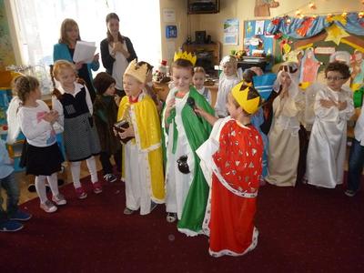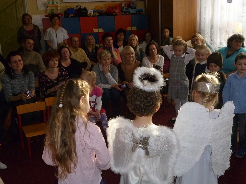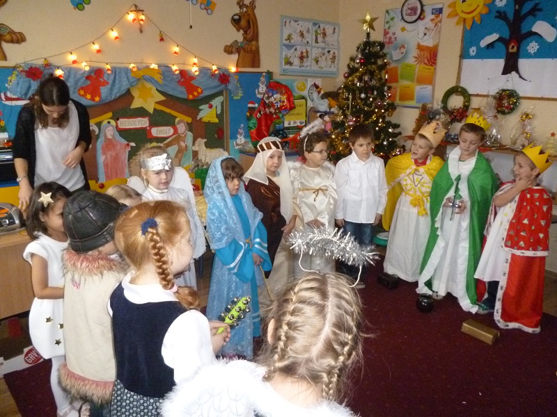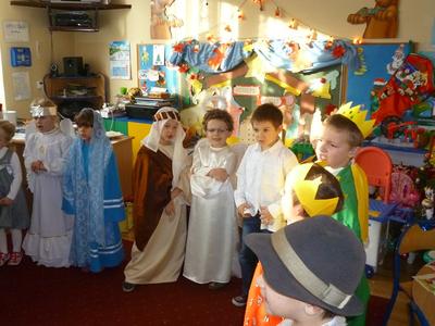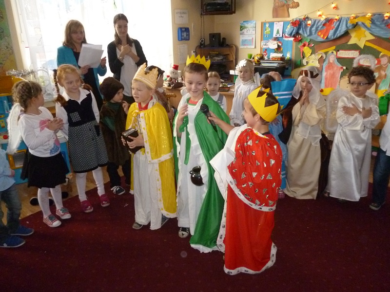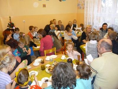 18 grudnia 2013r. odbyło się, należące już do tradycji naszego przedszkola, spotkanie opłatkowe. Honorowymi gośćmi w tym dniu byli rodzice naszych przedszkolaków. Dzieci już od rana nie mogły się doczekać swego jasełkowego występu oraz spotkania z rodzicami. Przedszkolaki przebrane w piękne stroje przedstawiły jasełka przy żłóbku. Mali aktorzy bardzo efektownie i z wielkim przejęciem odegrali swoje role i wystąpili przed publicznością. Po przedstawieniu i wspólnym kolędowaniu wszyscy złożyli sobie życzenia świąteczne i podzielili się opłatkiem. Na zakończenie rodzice wraz z dziećmi udali się na poczęstunek. Spotkanie opłatkowe przebiegało w niezwykle ciepłej atmosferze.
