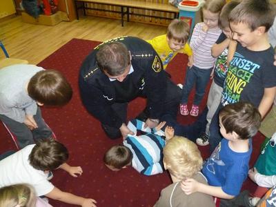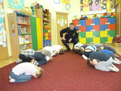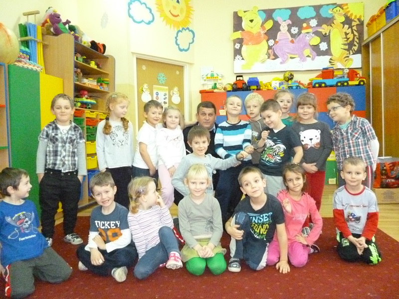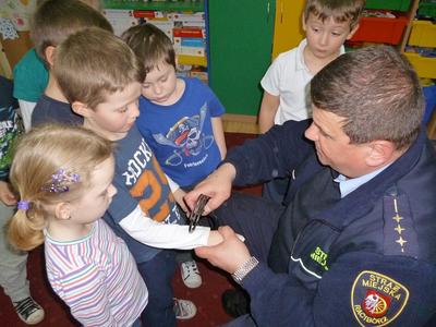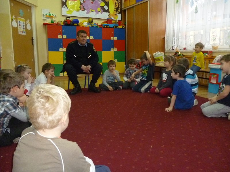 W związku ze zbliżającymi się feriami zimowymi przedszkole w Rzuchowie odwiedził funkcjonariusz Straży Miejskiej, który przeprowadził pogadankę na temat bezpieczeństwa podczas zimowej przerwy. Nasz gość omówił zagadnienia związane z bezpieczeństwem dzieci podczas zabaw na śniegu i przebywania w miejscu zamieszkania, przedstawił też zasady poruszania się po drogach. Przypomniał również o podstawowych numerach alarmowych w przypadku zdarzeń losowych oraz pokazał, co należy zrobić w razie ataku nieznanego psa. Dzieci wykazały duże zainteresowanie i aktywnie uczestniczyły w zajęciach. Najbardziej jednak wszystkim podobała się możliwość przymierzenia kajdanek oraz pokaz aresztowania złodzieja. Spotkanie upłynęło nam w miłej i serdecznej atmosferze. Serdecznie dziękujemy funkcjonariuszowi Straży Miejskiej za poświęcony czas oraz za pomoc w kształceniu wśród dzieci postawy bezpieczeństwa i uwagi.
