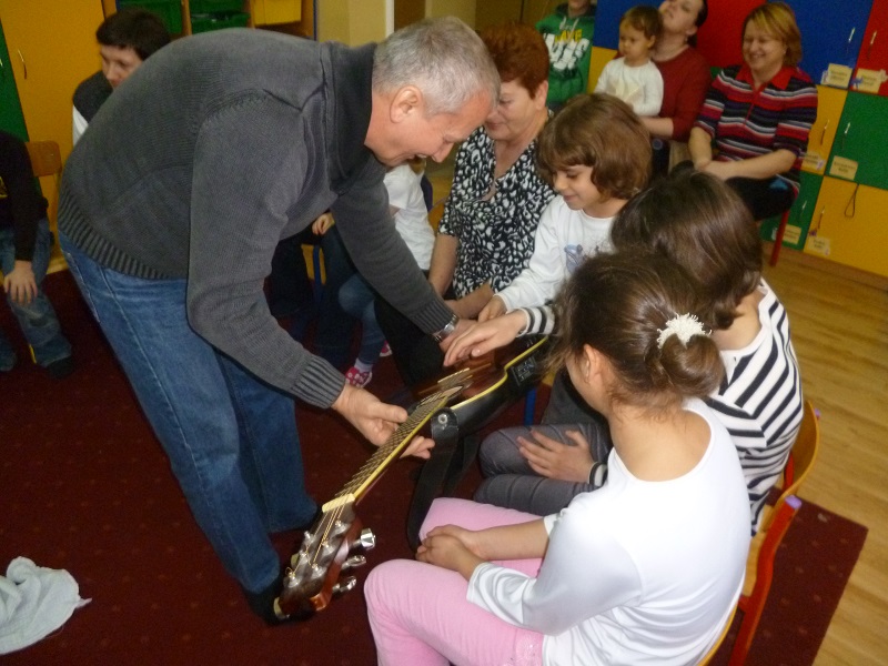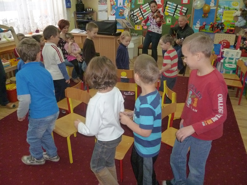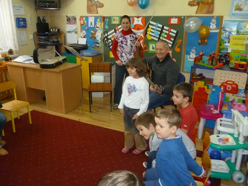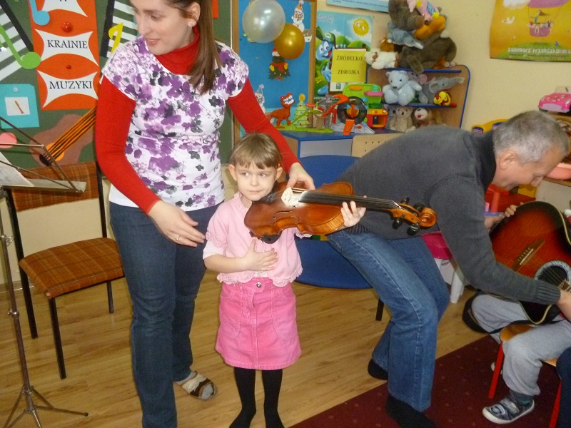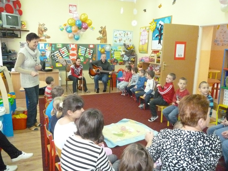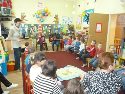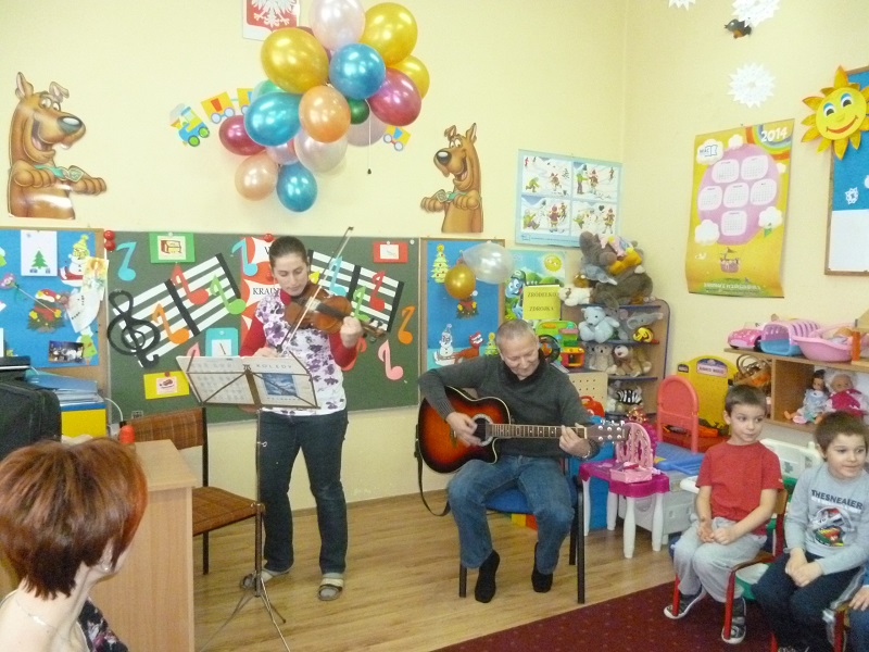 28 stycznia nasze przedszkole odwiedzili niezwykli goście - członkowie zespołu „Maja” - Marysia i Janek. Zagrali wspaniały koncert kolędowy. Przedszkolaki szybko włączyły się do wspólnej zabawy i głośno śpiewały znane kolędy. Dzieci wesoło bawiły się przy ulubionych muzycznych zabawach: „Jedzie pociąg”, „Stary niedźwiedź” i innych. Przedszkolaki miały także okazję, by zobaczyć skrzypce oraz gitarę z bliska, a nawet na nich zagrać. Należy pamiętać, iż muzyka jest bardzo ważnym elementem w pracy z dziećmi. Pozwala zrozumieć otaczający nas świat, dostarcza dziecku wiele radości podczas tańca oraz w czasie innego jej wykorzystania. Dziecko dzięki muzyce może wyrazić swoje pragnienia, uczucia i wyobrażenia. W czasie zabaw muzyczno - ruchowych następuje rozwój mięśni, poprawa postawy i pracy serca, wzmocnienie układu nerwowego. Dzieci uczą się płynnego i elastycznego ruchu. Cieszy nas fakt, że dzieci reagowały na muzykę bardzo spontanicznie i okazywały radość podczas tego spotkania.