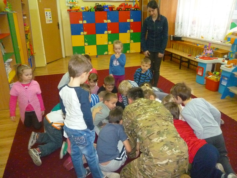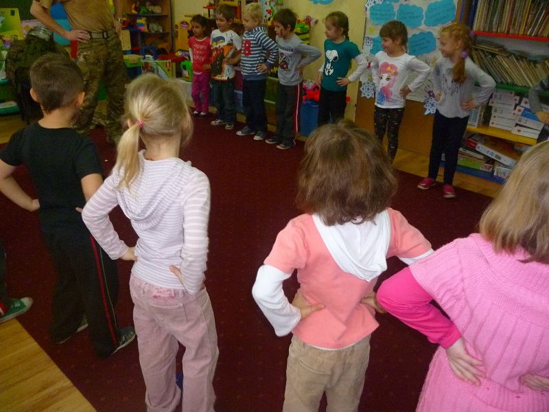 W czwartek 6 lutego do naszego przedszkola przybył żołnierz, który w ciekawy sposób opowiedział dzieciom, na czym polega jego praca oraz co należy do jego obowiązków. Nasz gość zaprezentował także mundur, zapoznając dzieci z emblematami i symbolami narodowymi. Pokazał różne akcesoria, które każdy żołnierz powinien mieć. Nauczył nas posługiwać się mapami oraz kompasem. Ponadto przeprowadził żołnierski trening, czyli musztrę. Przedszkolaki z zapartym tchem słuchały opowieści żołnierza oraz z zaangażowaniem wykonywały polecenia. Na koniec wizyty dzieci otrzymały słodki poczęstunek i podziękowały naszemu gościowi. Żołnierska wizyta była bardzo ciekawa i z pewnością na długo pozostanie w pamięci naszych przedszkolaków.