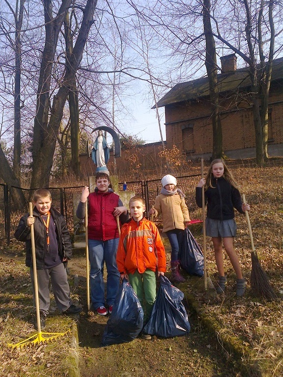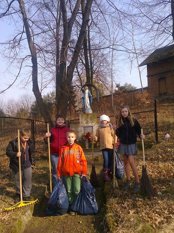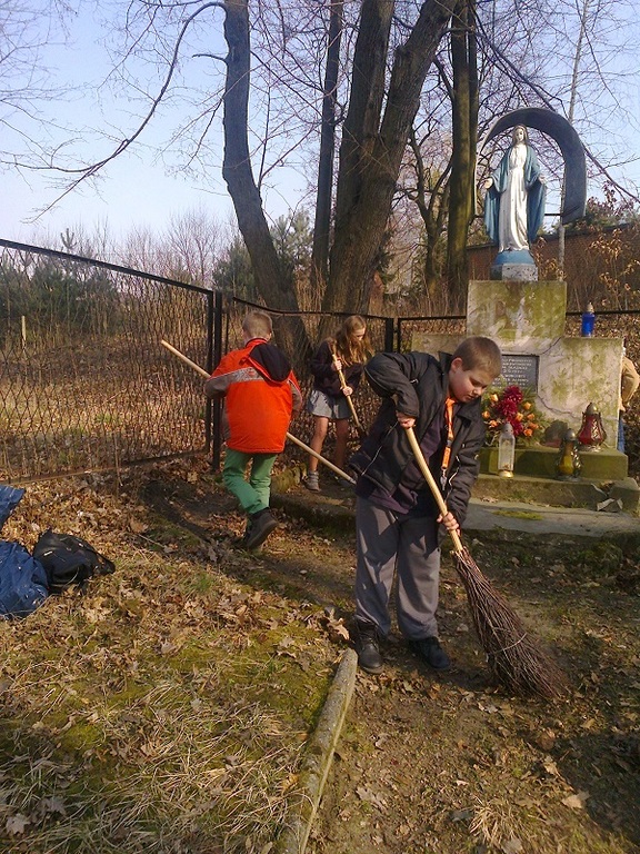 Zmęczeni ponurą, zimową pogodą z utęsknieniem szukamy ciepłych promieni słonecznych. Kiedy pogoda nabiera wiosennego tempa, z ochotą wychodzimy na świeże powietrze, by nacieszyć się budzącą przyrodą. Ale niestety mijająca zima ,,zostawiła" wiele po sobie - brud, śmieci, nieporządek. W związku z tym uczniowie szkolnego koła PCK postanowili już działać w tym zakresie. Zaczęli od uporządkowania pobliskiego miejsca pamięci narodowej - pomnika powstańców, który od lat jest pod opieką dzieci szkolnych. Z wiosenną ochotą i pełni energii zabrali się do pracy. Uporządkowali pomnik i jego obejście zbierając zeszłoroczne dekoracje, a potem zgrabili zeschłe liście i połamane gałązki. Po skończonej pracy oczom ukazał się widok uporządkowanego i zadbanego miejsca.