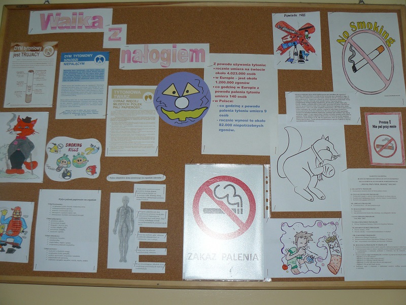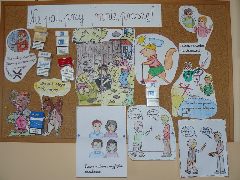 Na korytarzu szkolnym zawieszona została gazetka ścienna dotycząca palenia papierosów i jego zgubnego wpływu na życie każdego człowieka. Jednym z pierwszych działań był turniej zabaw i gier integracyjno - ruchowych - ,,Zdrowie moje, mojej rodziny i otoczenia", który cieszył się zainteresowaniem dzieci - mogły wtedy poznać dużo nowych i nieznanych zabaw, gier do wykorzystania w czasie wolnym, na spotkaniach rodzinnych, koleżeńskich. Kolejne zajęcia programowe zostały wzbogacone o dodatkowe środki - kolorowanki, puzzle, wiersze. Wykonane prace zostały wyeksponowane i zaprezentowane wszystkim uczniom, a także rodzicom przychodzącym do szkoły.